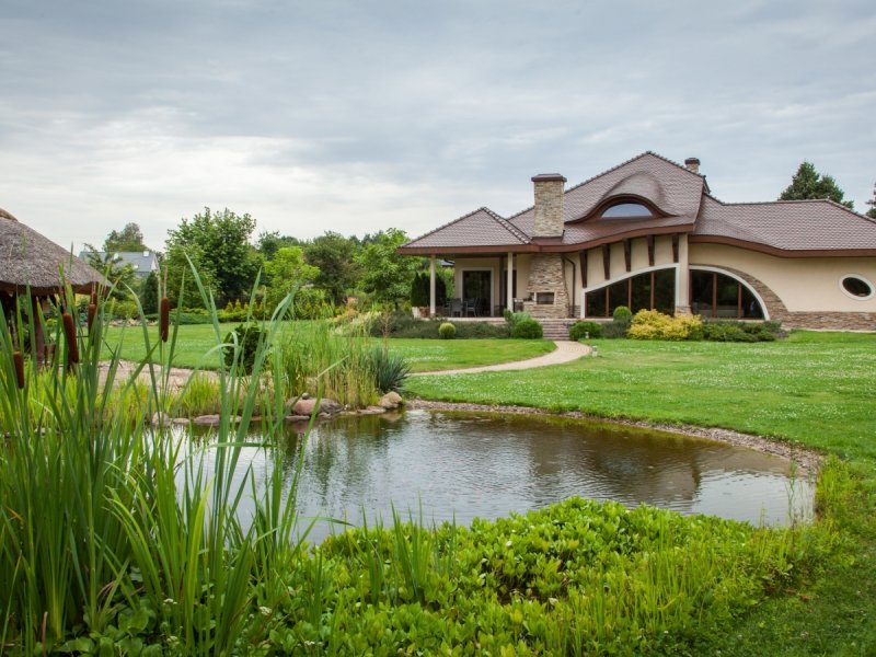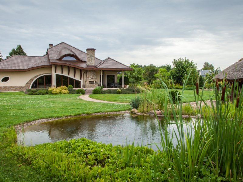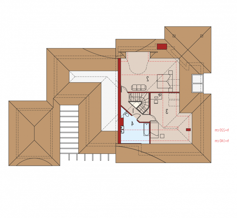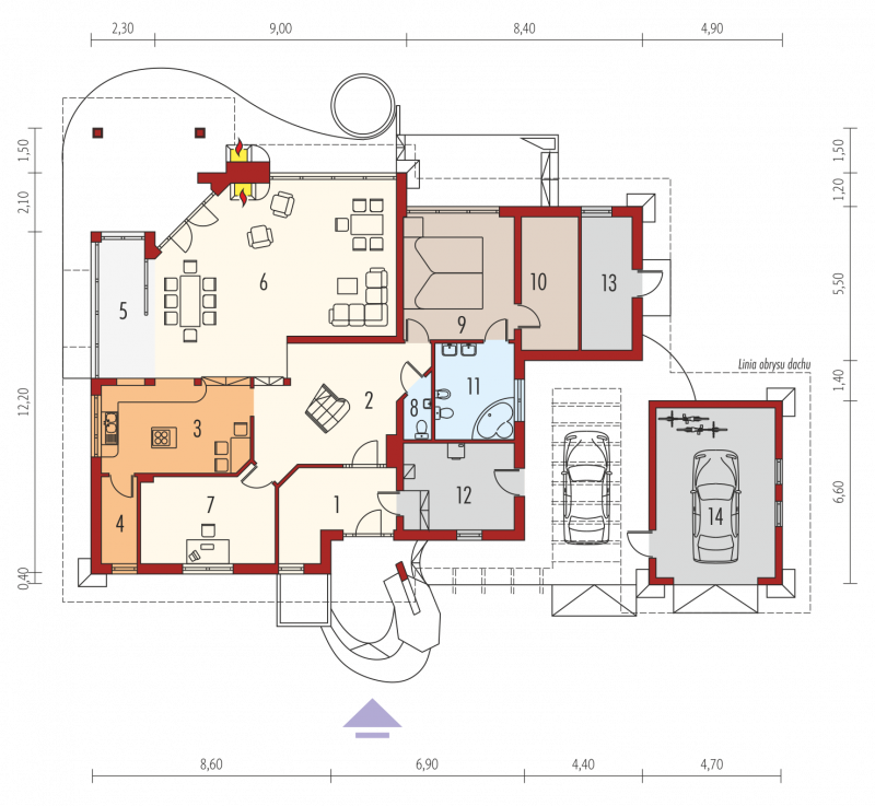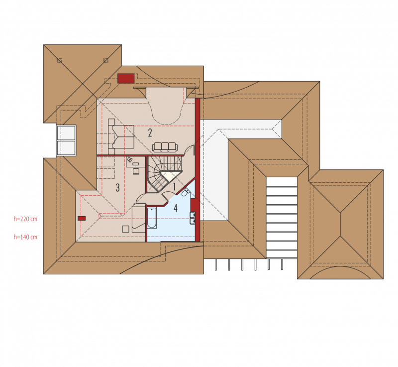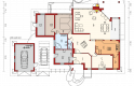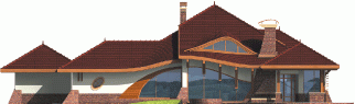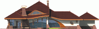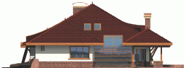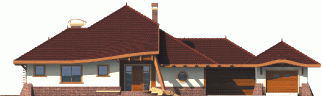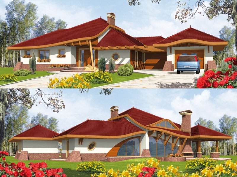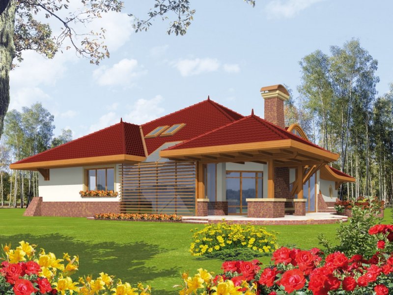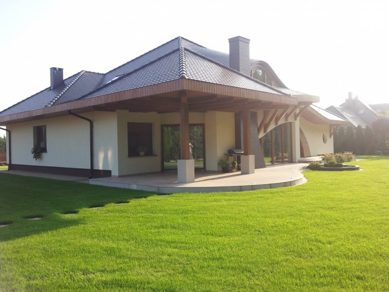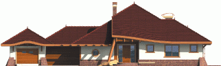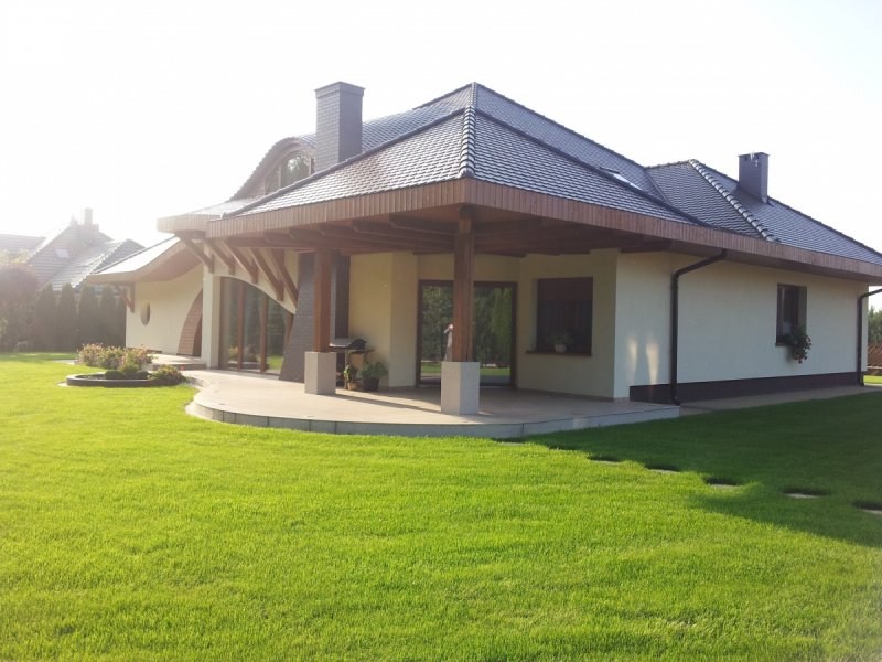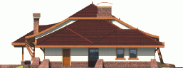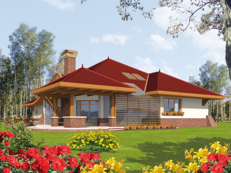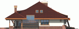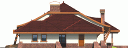 Dom parterowy z poddaszem użytkowym, niepodpiwniczony, z garażem, przeznaczony dla 4-5-osobowej rodziny. Jego strefę dzienną stanowi duża przestrzeń składająca się z kuchni, jadalni, pokoju dziennego i oranżerii oddzielonej od nich delikatną, ażurową ścianą. Do strefy dołączono zadaszoną część tarasu, która latem może stanowić przedłużenie pokoju dziennego. W części nocnej zaprojektowano sypialnie rodziców wraz z garderobą i łazienką. Dwie sypialnie dziecięce umieszczono na poddaszu.