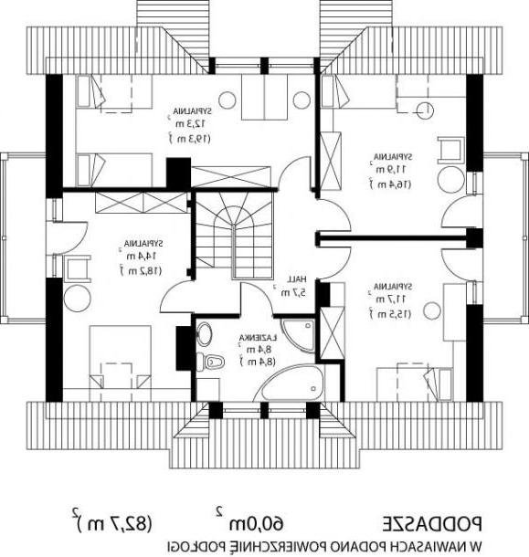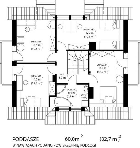 * oraz strefę nocną (poddasze), w której znajdują się cztery sypialnie i łazienka.