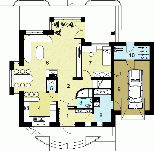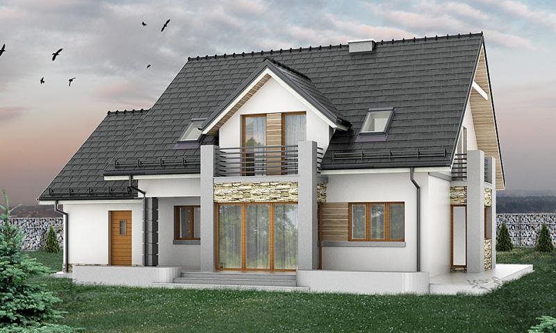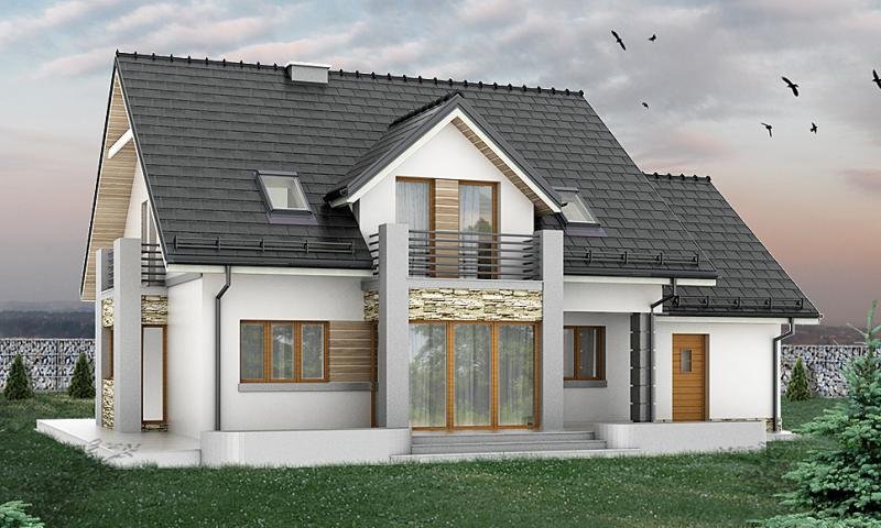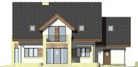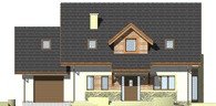 Dom jednorodzinny, przeznaczony dla 4 - 5 osobowej rodziny. Budynek wolnostojący, parterowy (niepodpiwniczony) z użytkowym poddaszem. W budynku zaprojektowano dwie strefy: dzienną (parter), w skład której wchodzą - wiatrołap; hall; łazienka; kuchnia, jadalnia; salon; pokój; spiżarnia; 2 X pom. gospodarcze i garaż;