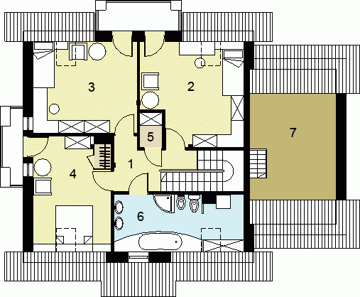 oraz strefę nocną (poddasze), w której znajdują się trzy sypialnie, garderoba, łazienka i pralnia oraz strych.