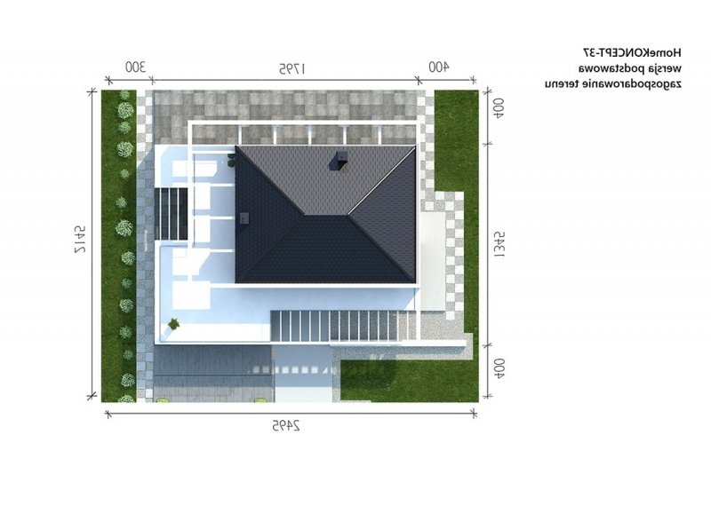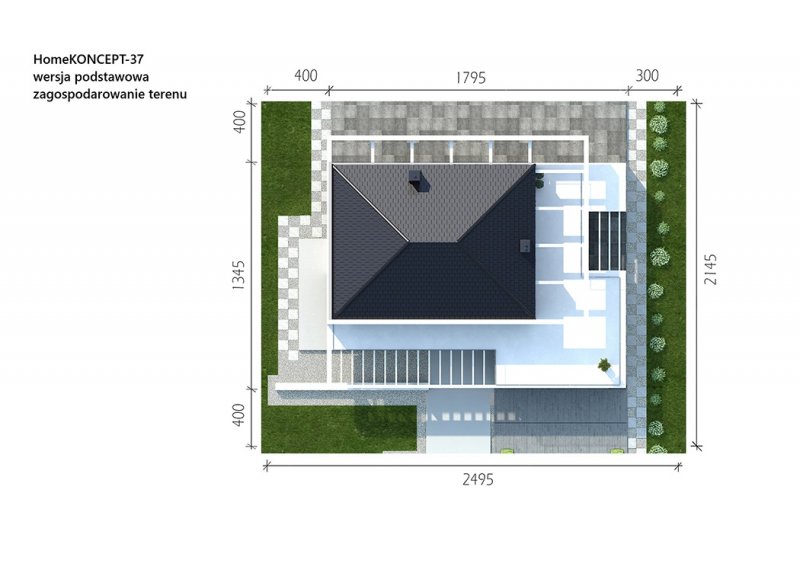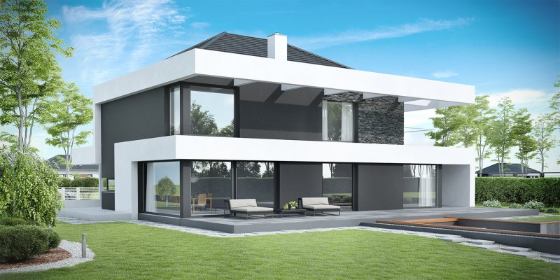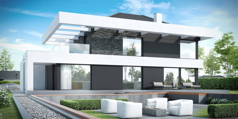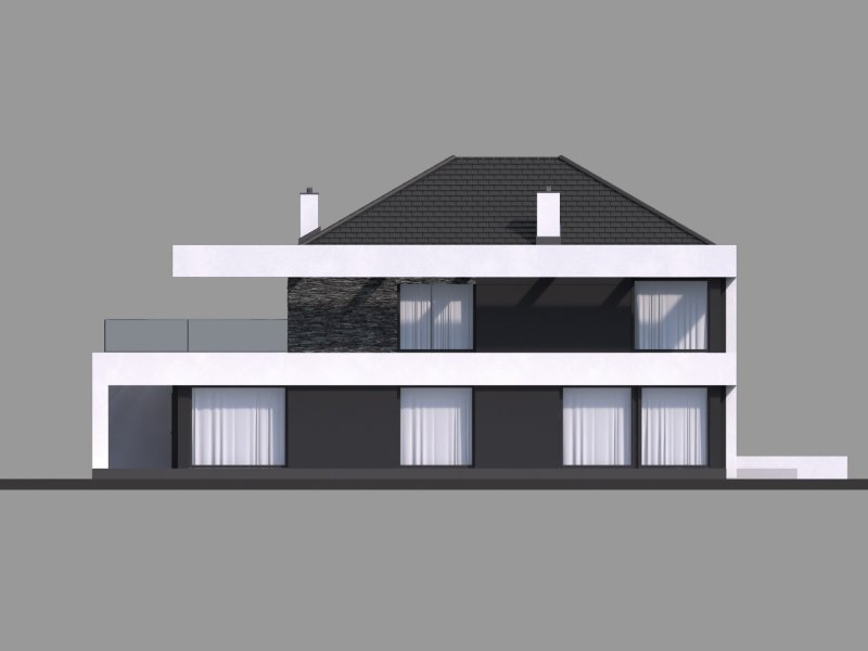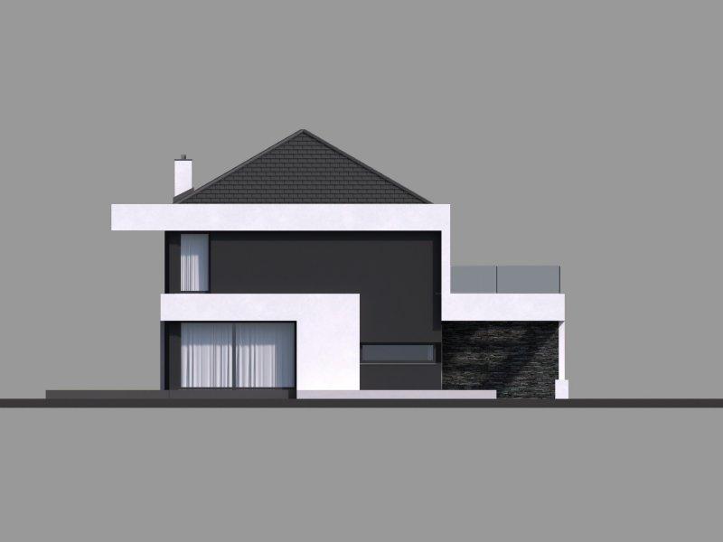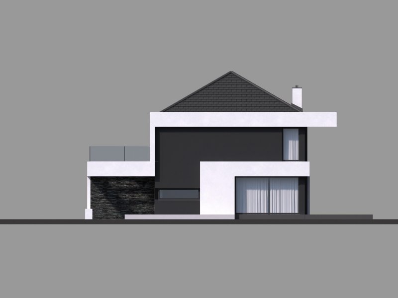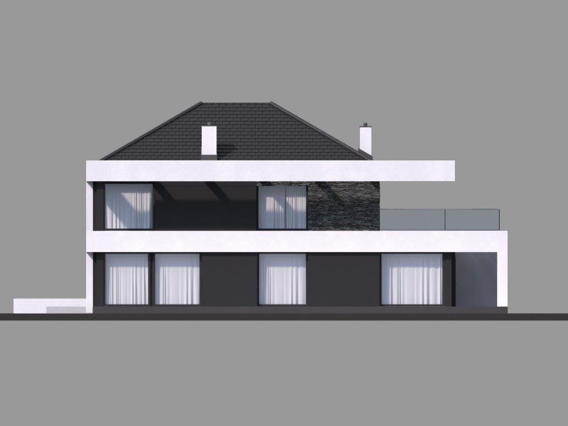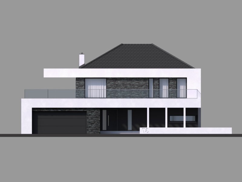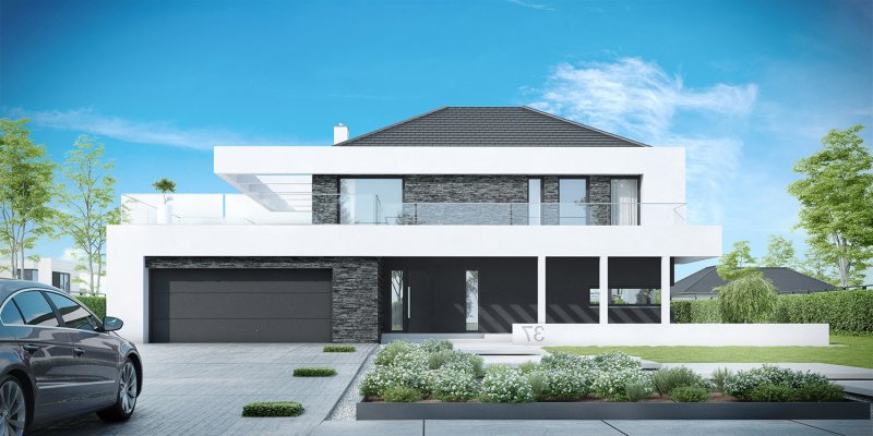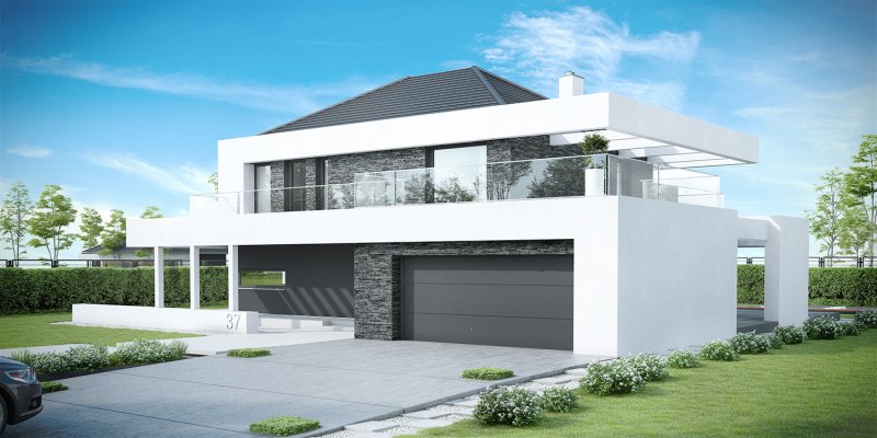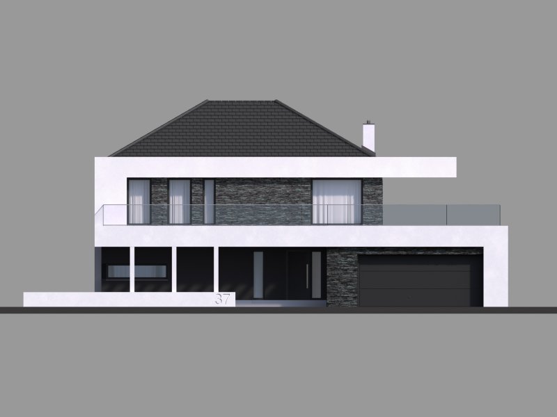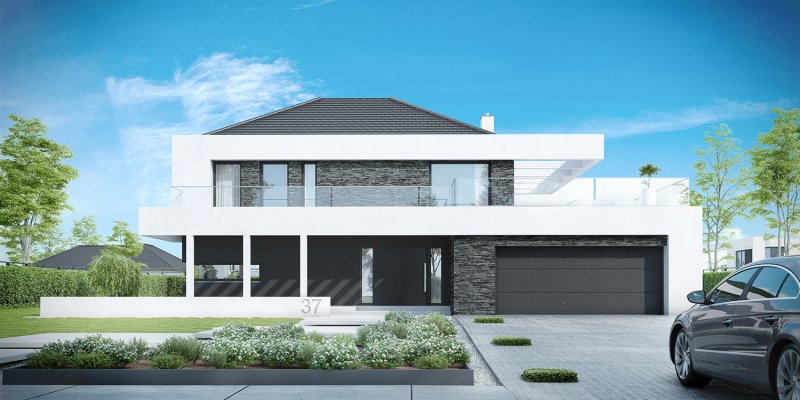 HomeKONCEPT-37 to projekt piętrowego domu o nowoczesnej i wyrazistej stylistyce. Prostą, spójną bryłę urozmaica z zewnątrz okalające dom belkowanie oraz efektowna elewacja. Połączenie białego i grafitowego tynku z naturalnym kamieniem elewacyjnym nadaje całości wyjątkowej elegancji.