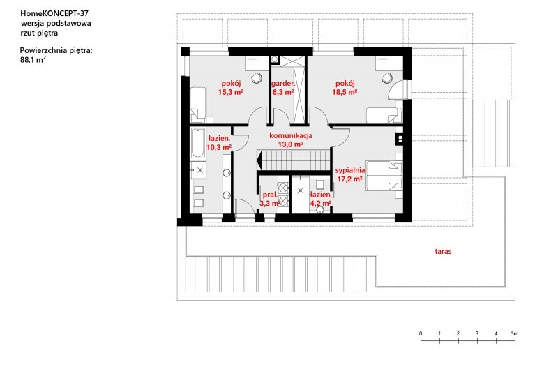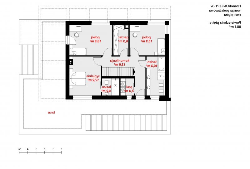 Na piętrze wydzielone zostały trzy duże pokoje, w tym sypialnia małżeńska z własną łazienką. Znajduje się tu również duża garderoba, druga łazienka oraz pralnia. Z części komunikacyjnej można dostać się na przyjemny, przestronny taras osłonięty białą pergolą.
