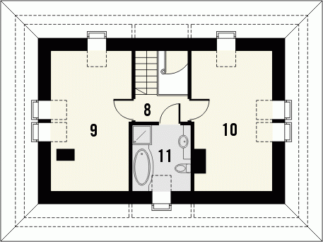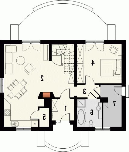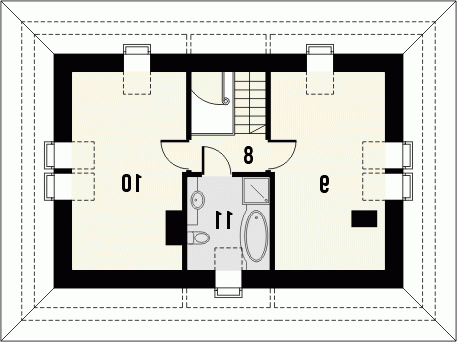 Budynek niepodpiwniczony, piętrowy, bez garażu. Parter mieści jednoprzestrzenną strefę dzienną z kuchnią otwartą na salon oraz reprezentacyjnymi schodami zlokalizowanymi naprzeciwko wejścia. Zaletą jest też duża sypialnia z łazienką oraz pomieszczenie gospodarcze z bezpośrednim wyjściem na zewnątrz. Na poddaszu znalazły się dwa dodatkowe pokoje i druga łazienka. Dokumentacja dostępna również w odbiciu lustrzanym.