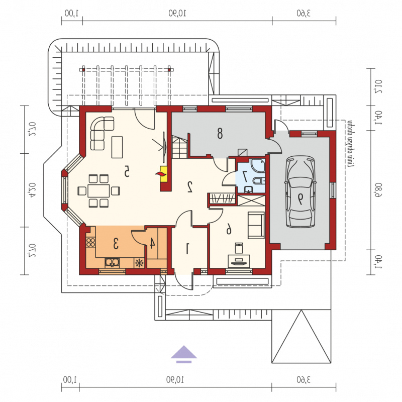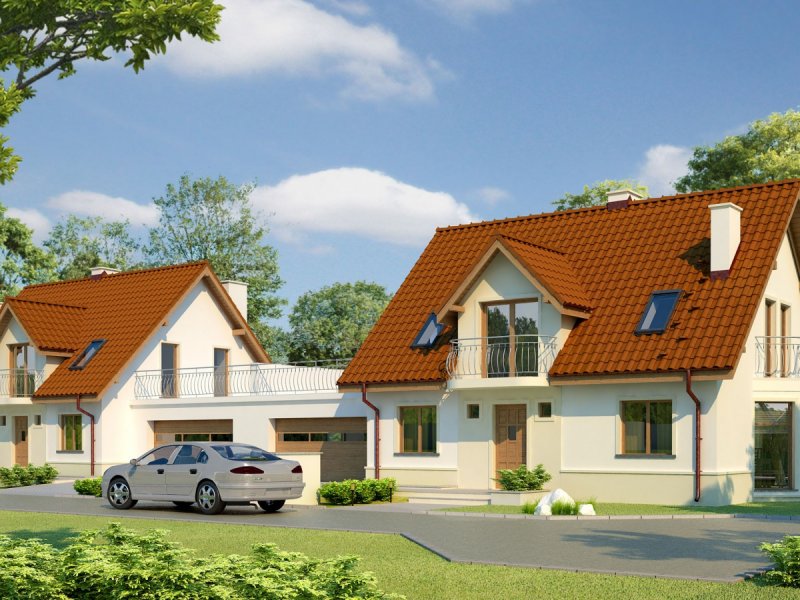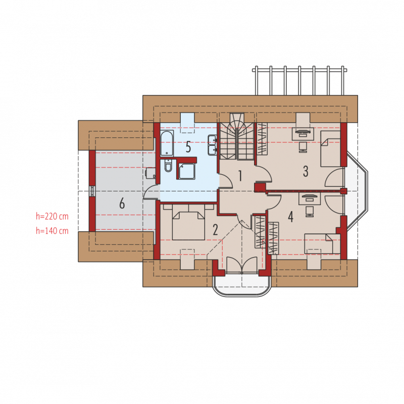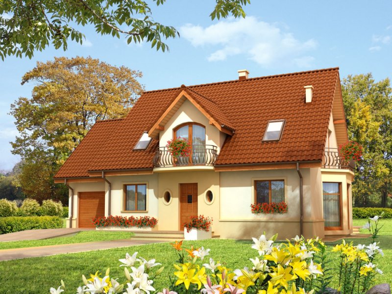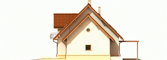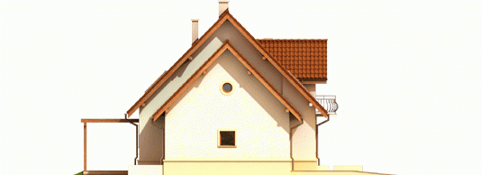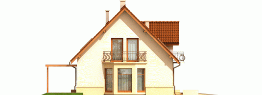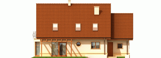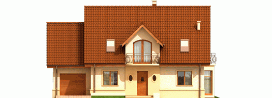Dom parterowy z użytkowym poddaszem, niepodpiwniczony, z garażem jednostanowiskowym, przeznaczony dla 4-5-osobowej rodziny. Strefa wejściowa została wyraźnie podkreślona lukarną z balkonem. Po przejściu przez wiatrołap roztacza się przed nami spory hol, przestronny pokój dzienny z otwartą kuchnią i jasną częścią jadalniana w przeszklonym wykuszu. Mamy również komfortowy gabinet oraz dużą część gospodarczą. Wygodne rozwiązanie przejściowego pomieszczenia gospodarczego ułatwia komunikację między garażem a resztą budynku. Cała strefa poddasza z trzema sypialniami, łazienką i strychem, to część nocną. Istnieje wersja projektu z garażem dwustanowiskowym oraz bliźniak (wizualizacje w plikach do pobrania).