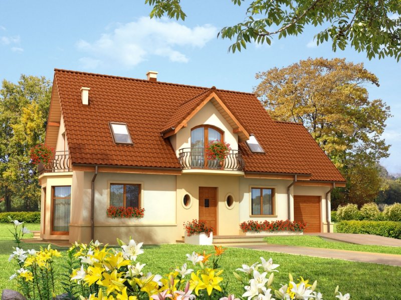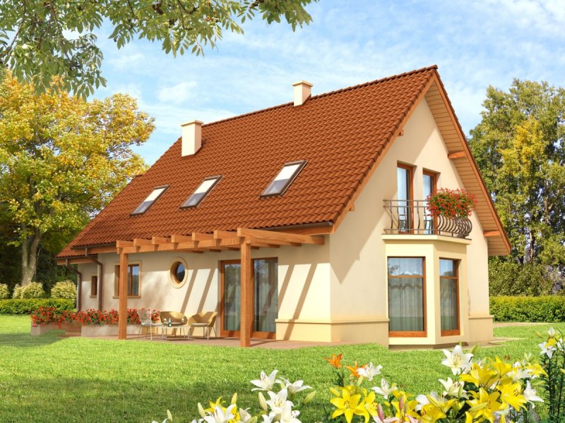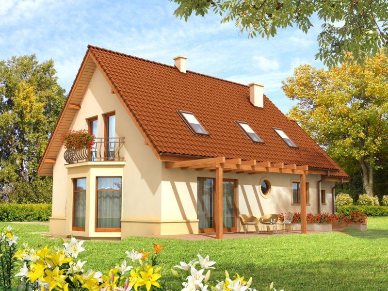Dach: konstrukcja drewniana, ocieplenie wełna mineralna 30 cm, dachówka ceramiczna lub cementowa