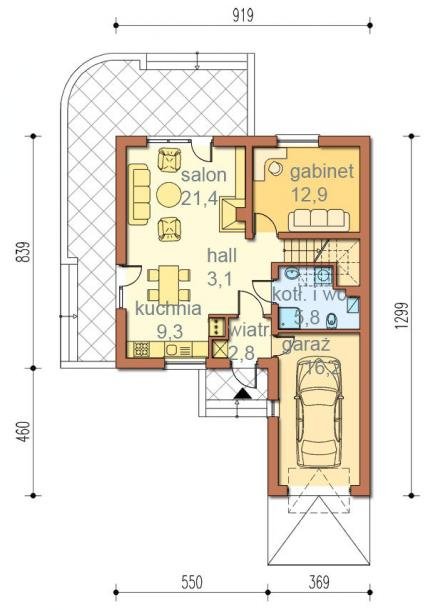 Część dzienna na parterze składa się z wiatrołapu, hallu, kuchni z jadalnią oraz pokoju dziennego i gabinetu. WC i kotłownia znajdują się w jednym pomieszczeniu obok wbudowanego jednostanowiskowego garażu.