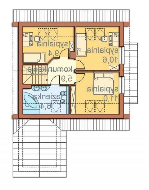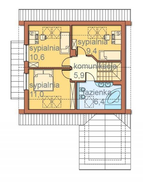Część nocną na poddaszu tworzą: trzy duże sypialnie, hall i wygodna łazienka. Wszystkie sypialnie i łazienka będą doświetlone za pomocą okien połaciowych, dodatkowo dwie sypialnie posiadają okna w ścianie szczytowej.