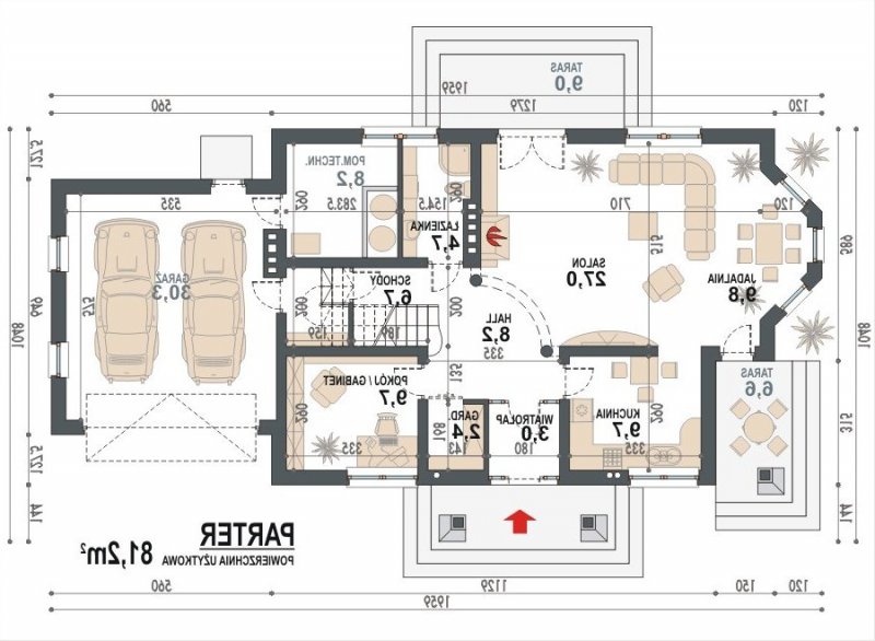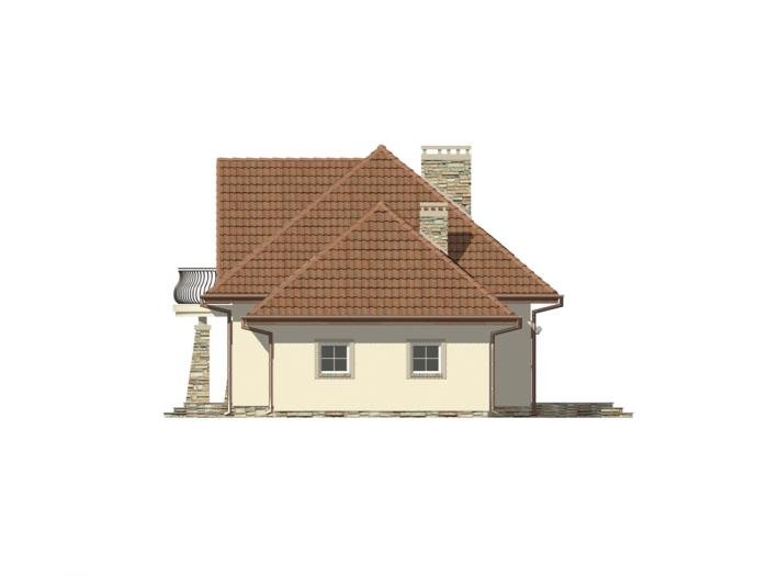 * Na parterze zaprojektowano reprezentacyjny otwarty salon z kominkiem połączony z aneksem jadalnym w wykuszu, kuchnię, pokój (gabinet), łazienkę, garderobę oraz garaż, wiatrołap i kotłownię