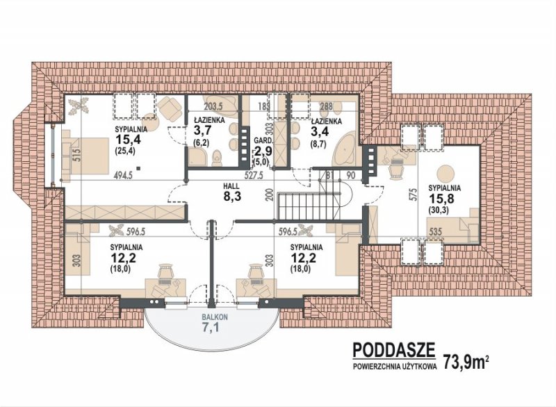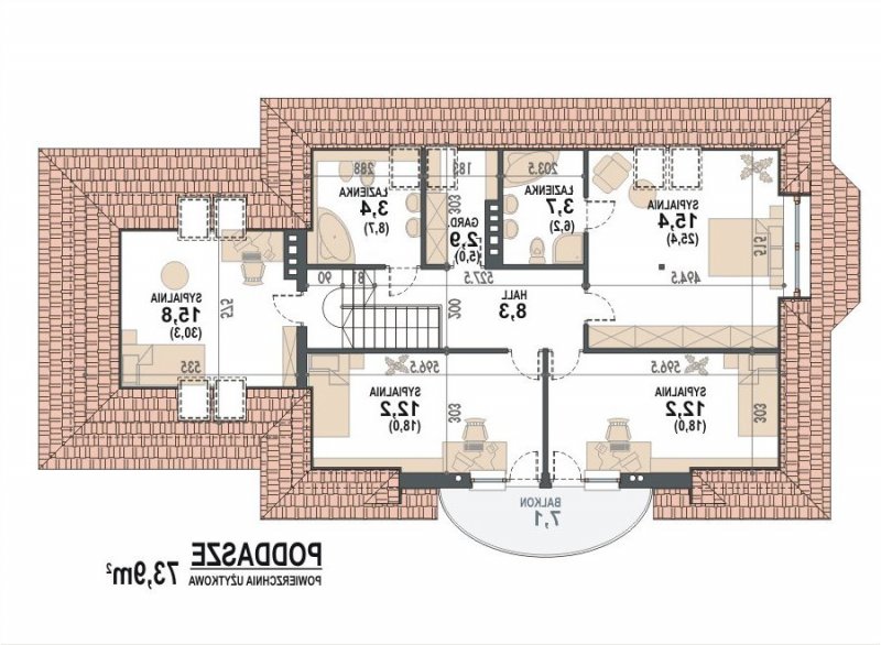 * Na poddaszu zaprojektowano 3 sypialnie (sypialnia rodziców z własną łazienką), pokój rekreacyjny, który można zaaranżować jako dodatkową sypialnię oraz ogólnodostępną łazienkę i garderobę.