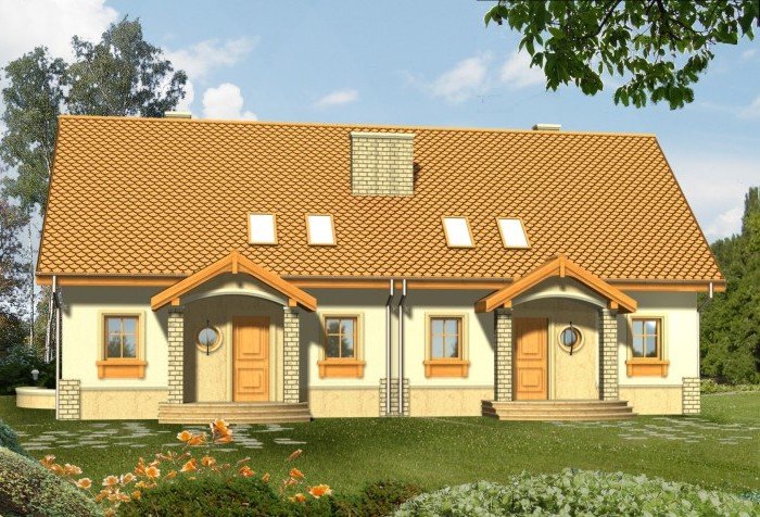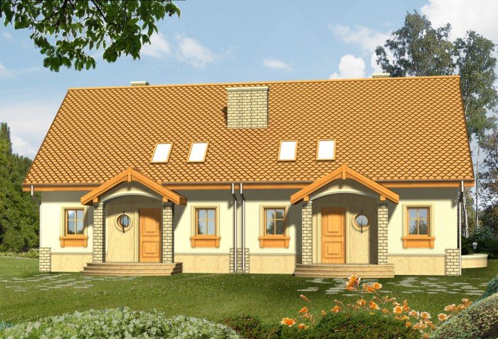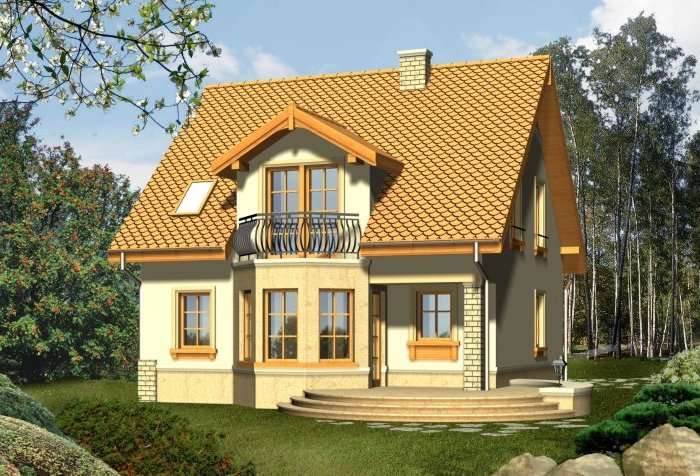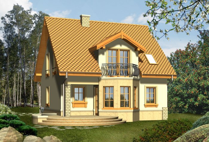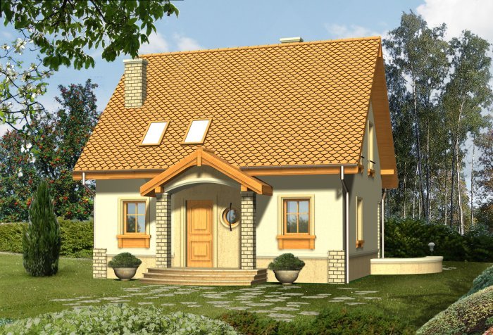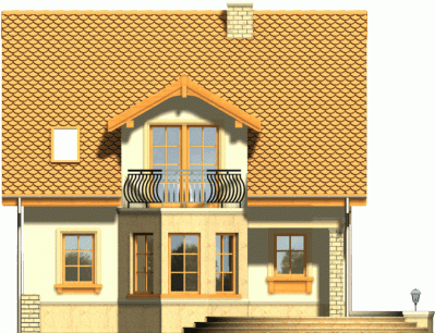 Dom wyróżnia się symetryczną fasadą wejściową z zadaszonym wejściem oraz ciekawym balkonem nad wykuszem od strony ogrodu. Pomimo niewielkiej powierzchni posiada dużo pomieszczeń oraz dzięki połączeniu hallu ze schodami z salonem wnętrze domu powiększa się optycznie.