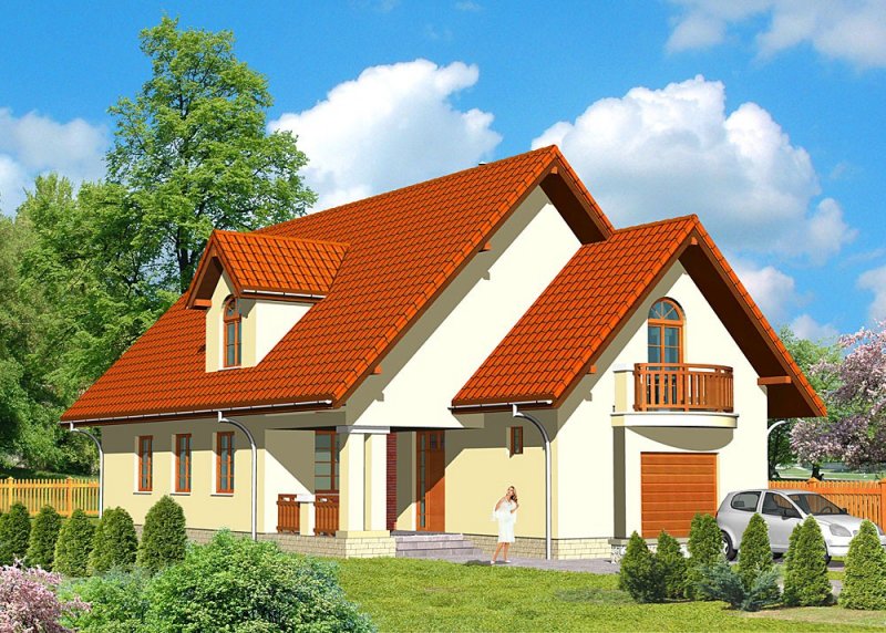Dom jednorodzinny, parterowy, z poddaszem użytkowym i jednostanowiskowym garażem.