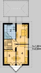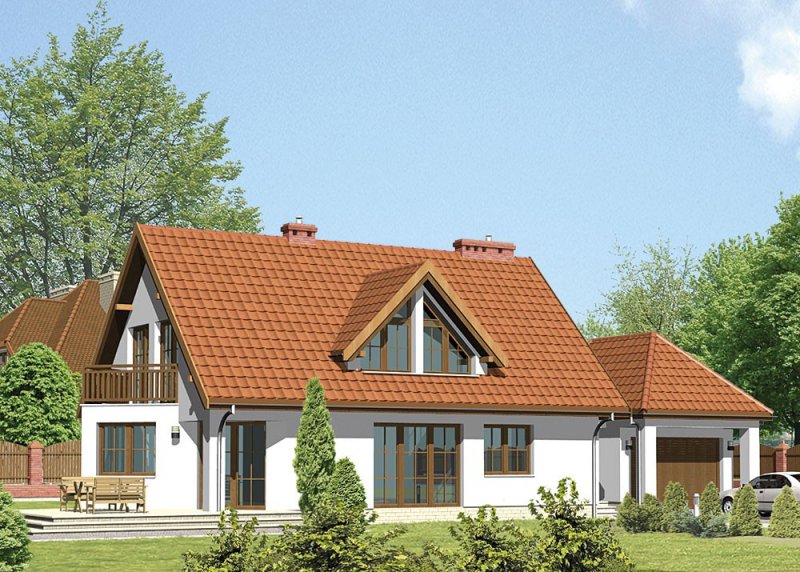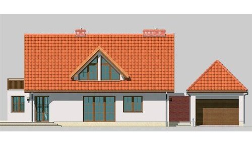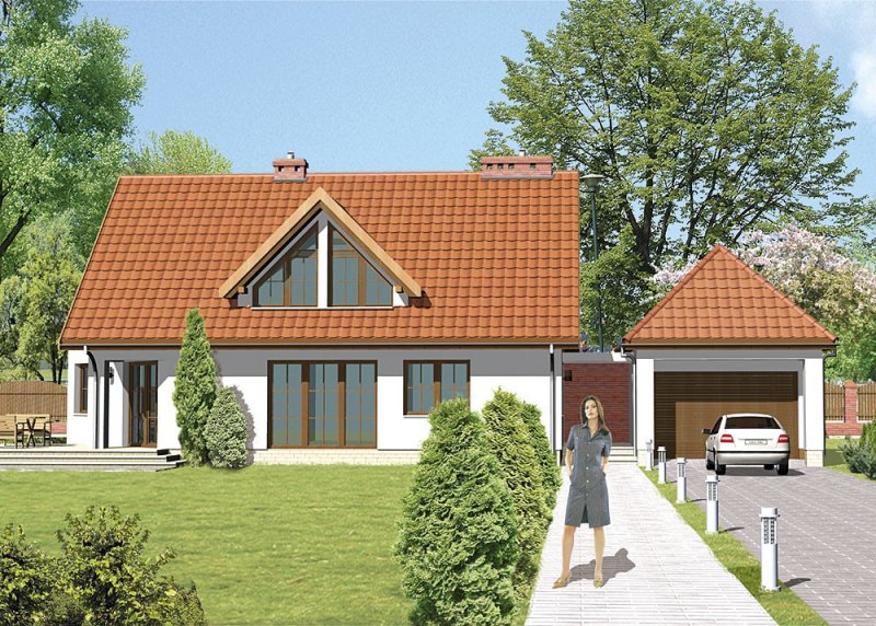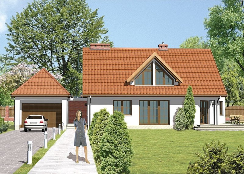 Dom jednorodzinny, parterowy, z poddaszem użytkowym i jednostanowiskowym garażem.