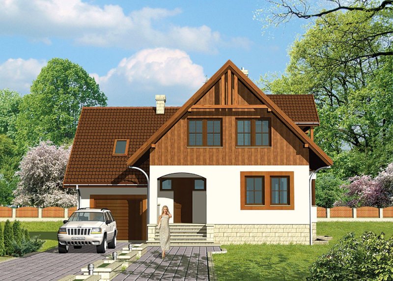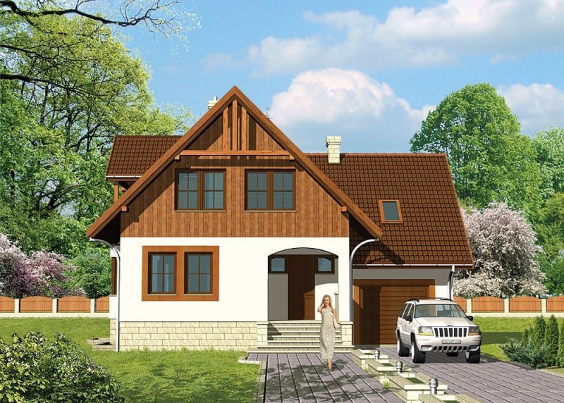 Dom jednorodzinny, parterowy, z poddaszem użytkowym i jednostanowiskowym garażem, podpiwniczony.