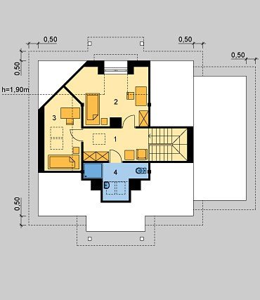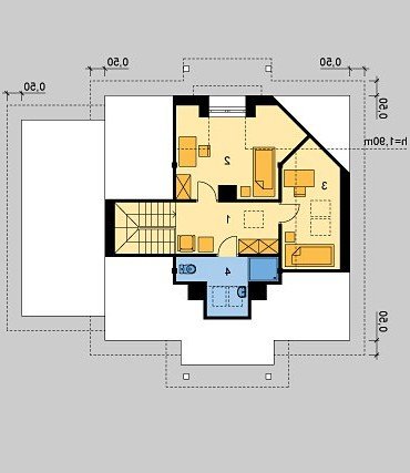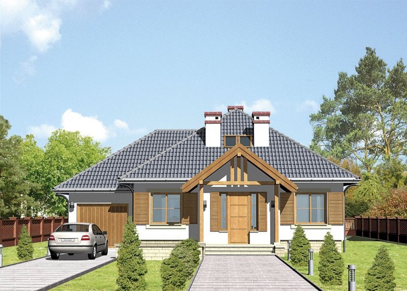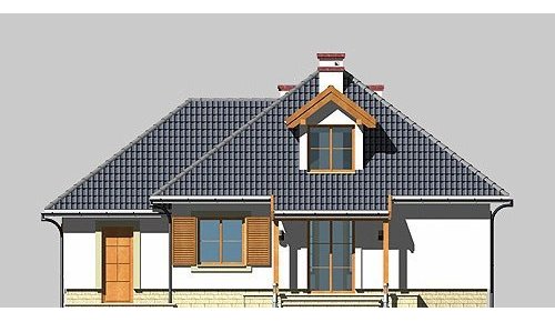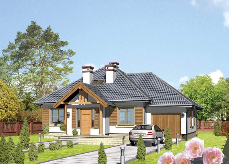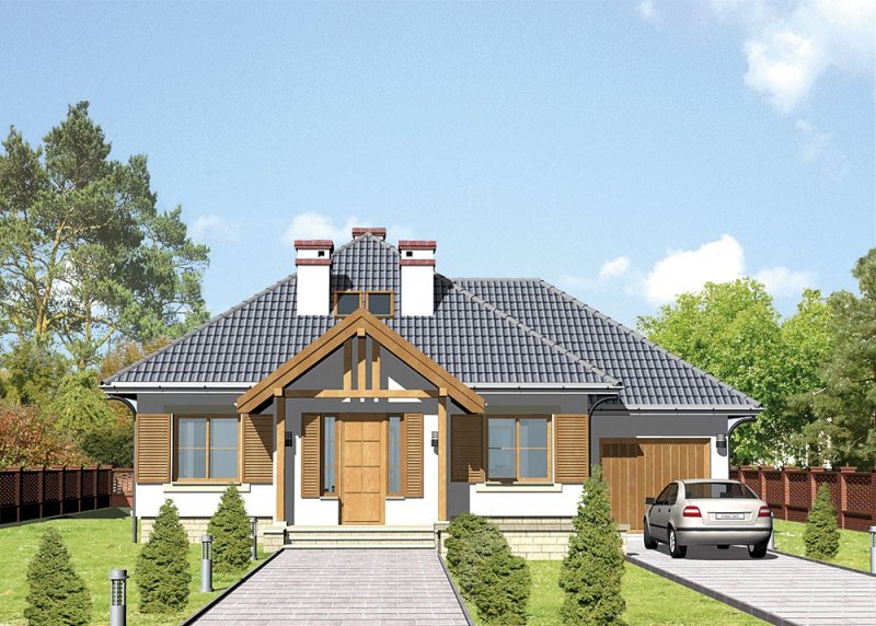 Dom jednorodzinny, parterowy, z poddaszem użytkowym i jednostanowiskowym garażem.