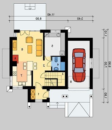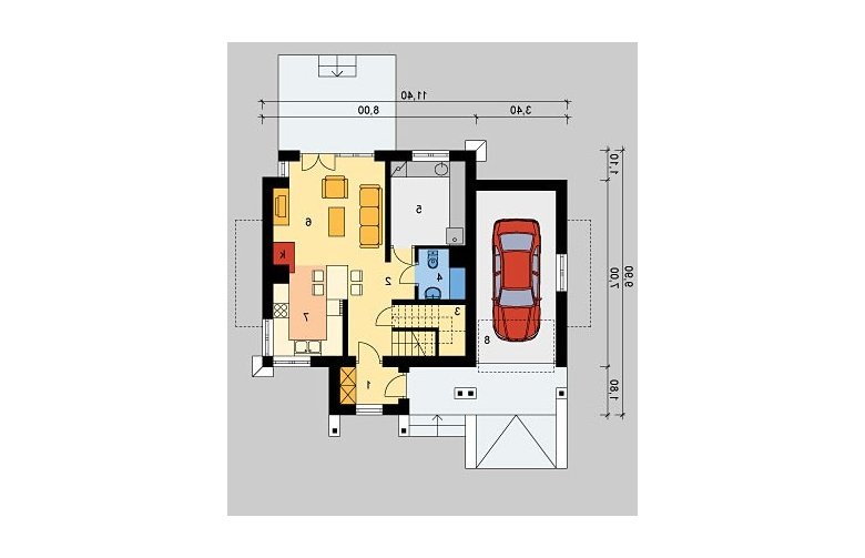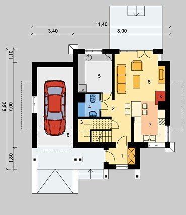- Elewacje: wykończone tynkiem sylikatowym, cokoły obłożone płytkami klinkierowymi