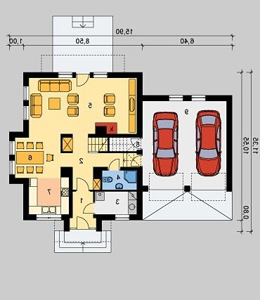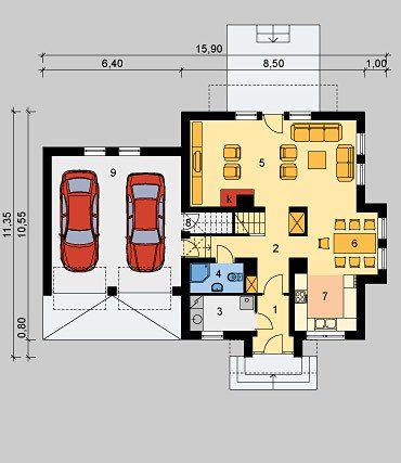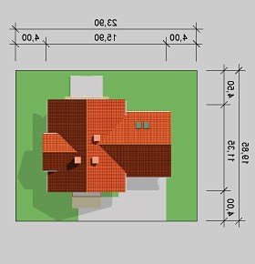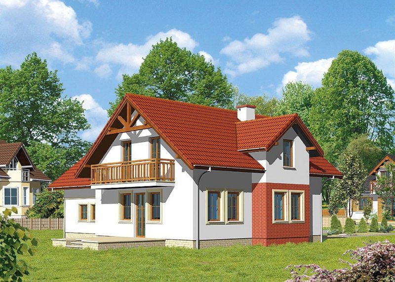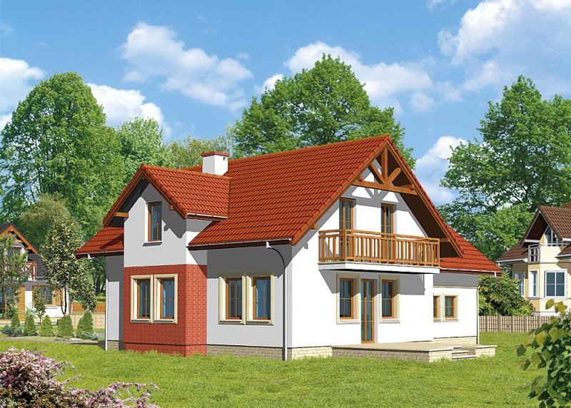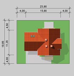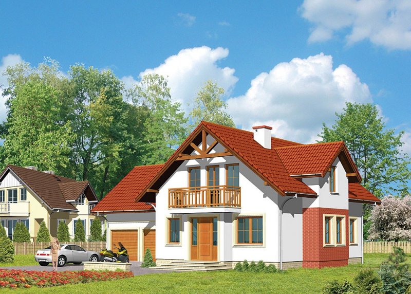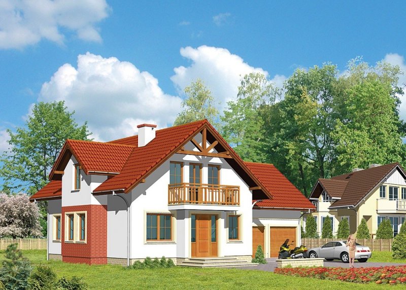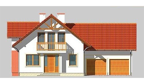 Dom jednorodzinny, parterowy, z poddaszem użytkowym i dwustanowiskowym garażem.