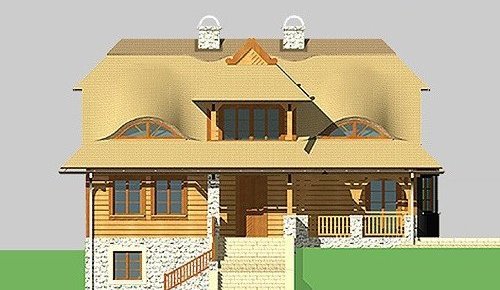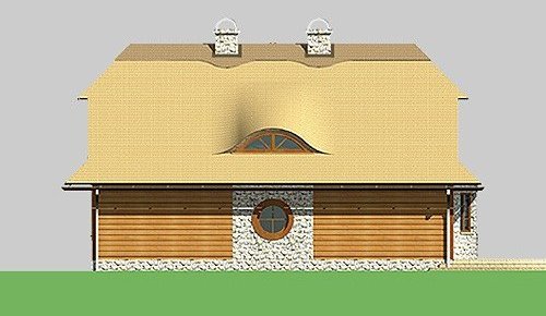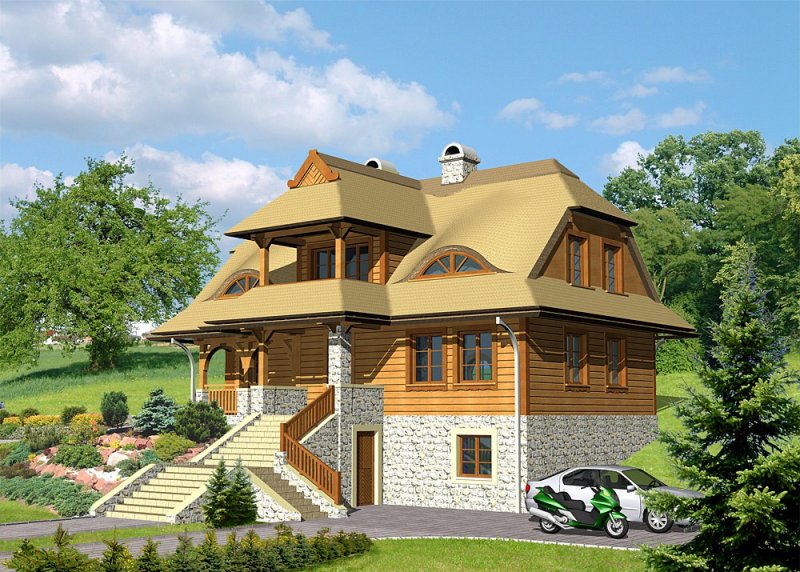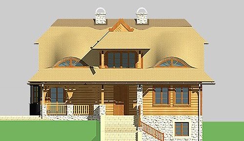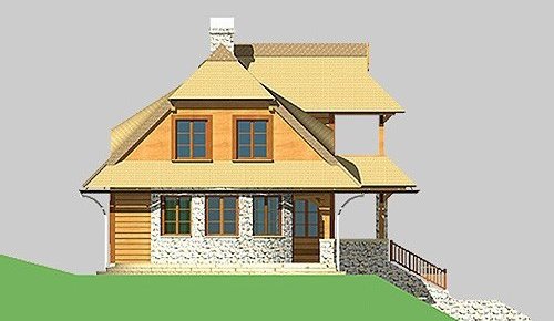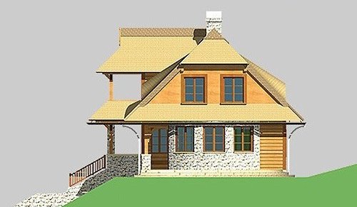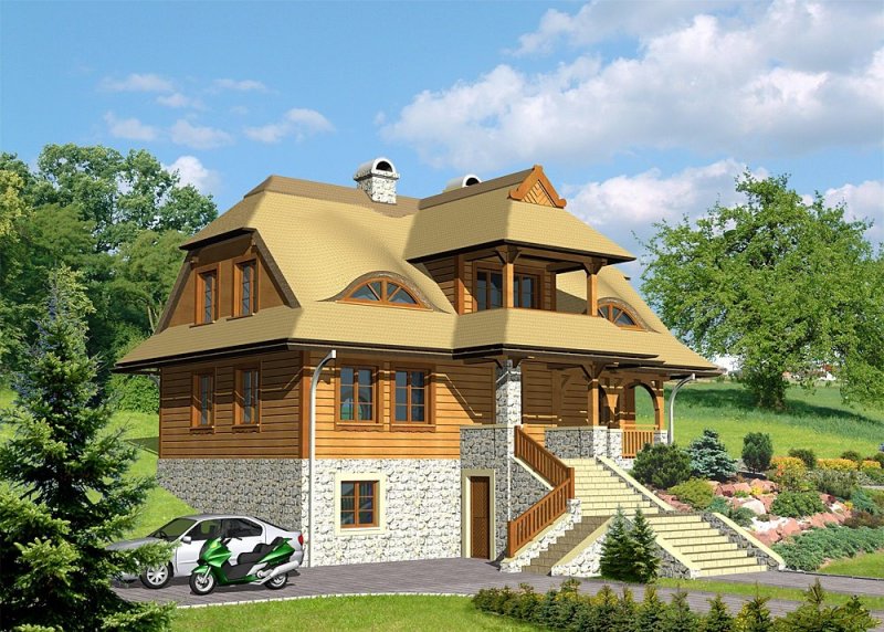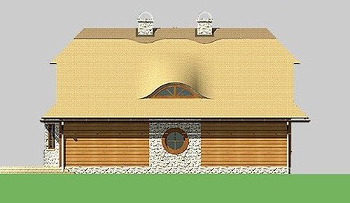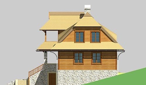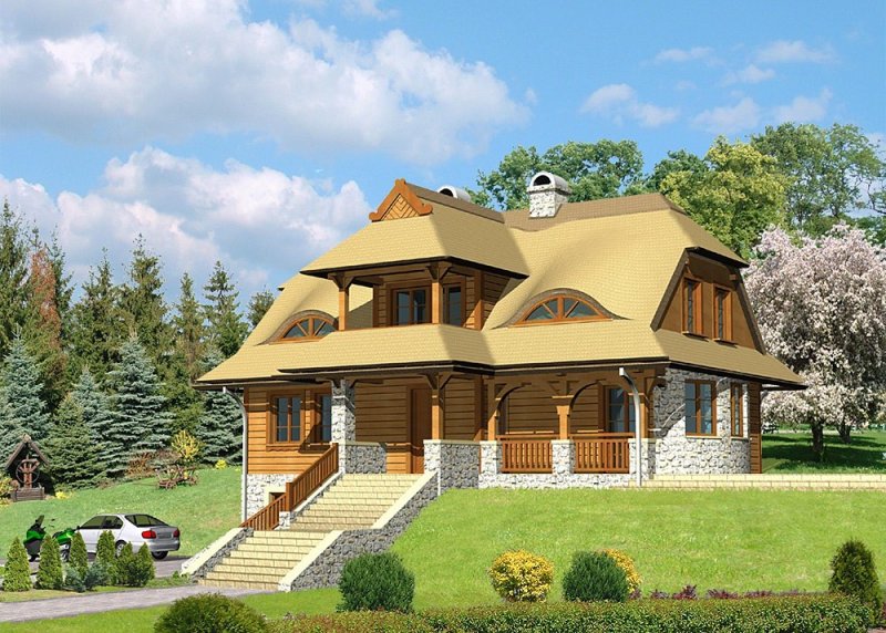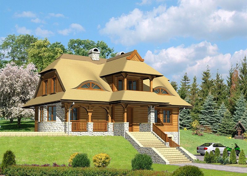 - Elewacje: wykończone brusami drewnianymi, cokoły budynku obłożone kamieniem naturalnym