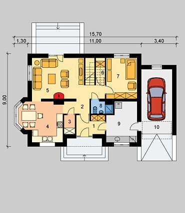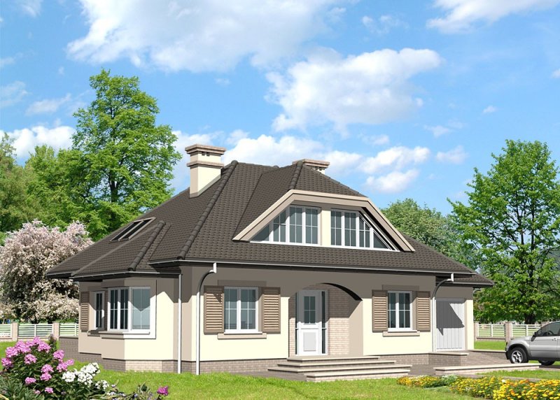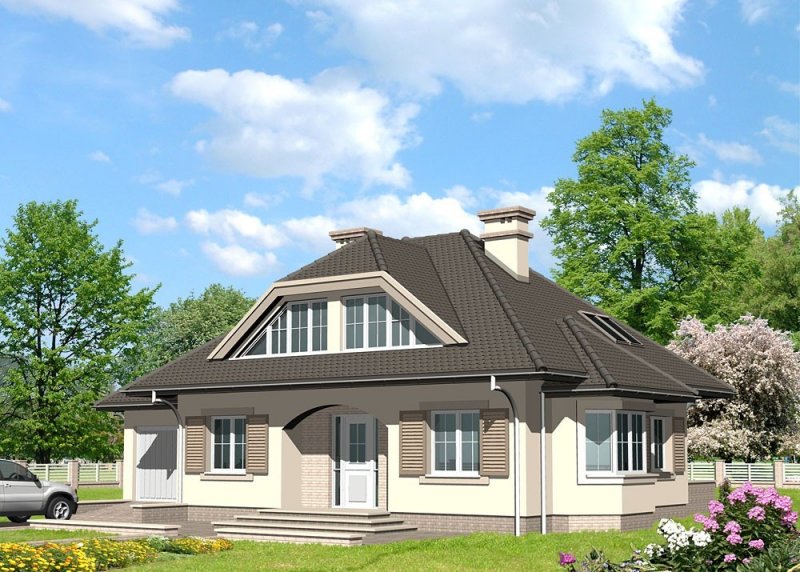 Dom jednorodzinny, parterowy, z poddaszem użytkowym i jednostanowiskowym garażem.