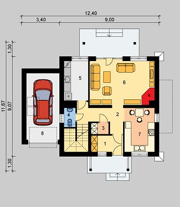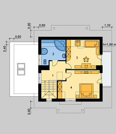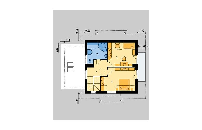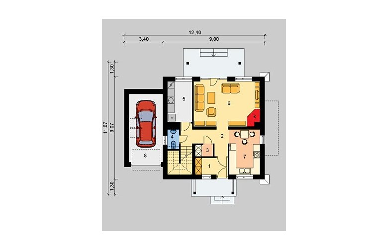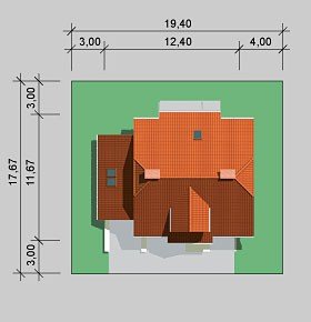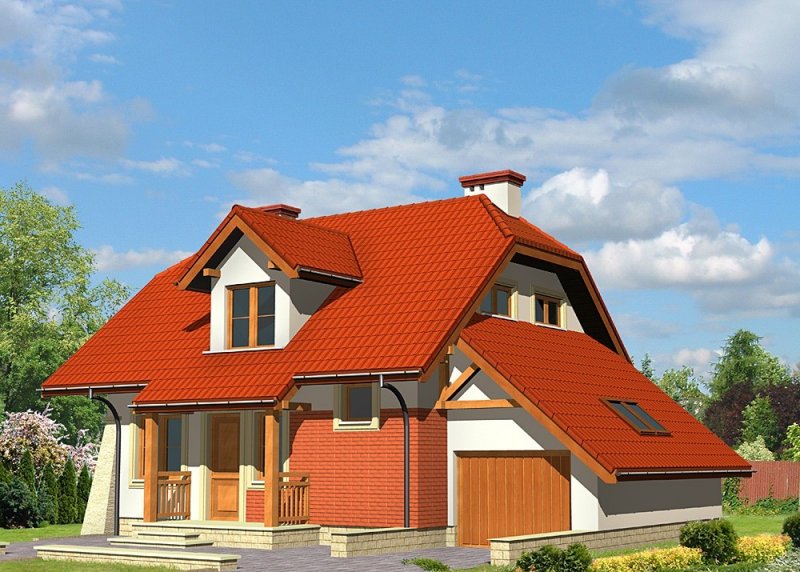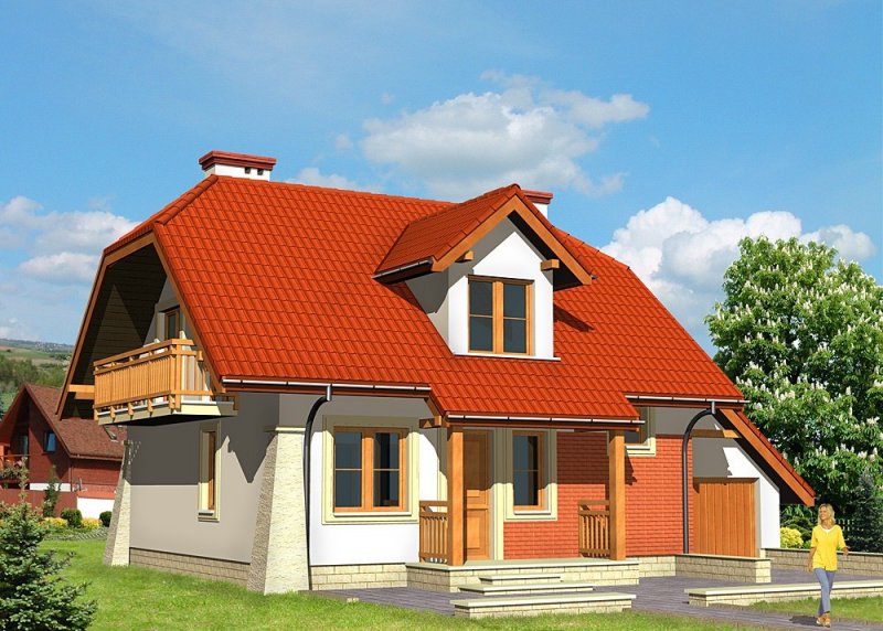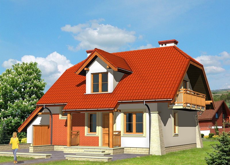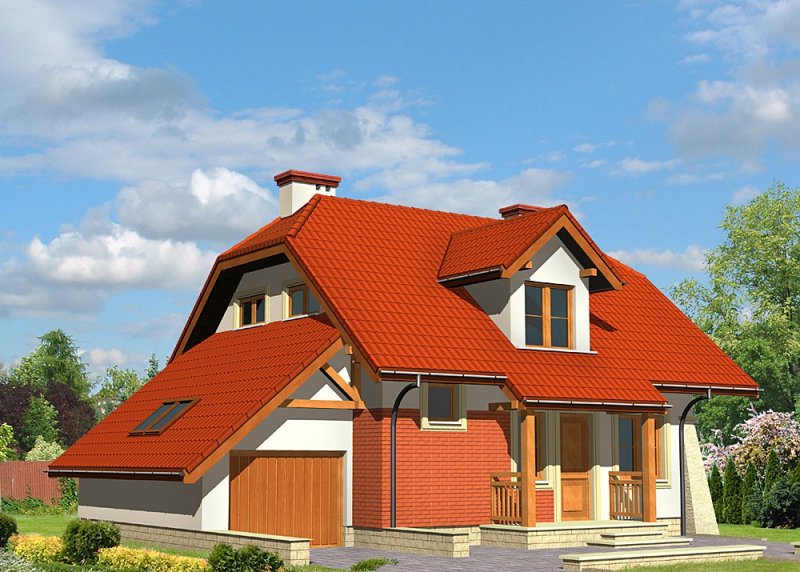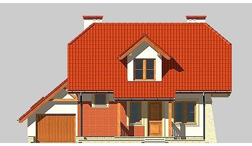 Dom jednorodzinny, parterowy, z poddaszem użytkowym i jednostanowiskowym garażem.