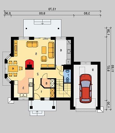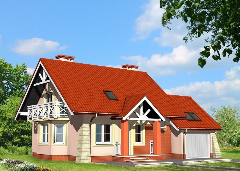 Dom jednorodzinny, parterowy, z poddaszem użytkowym, z jednostanowiskowym garażem.
