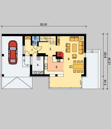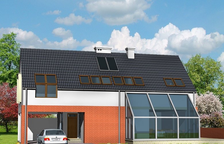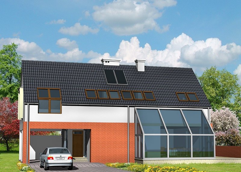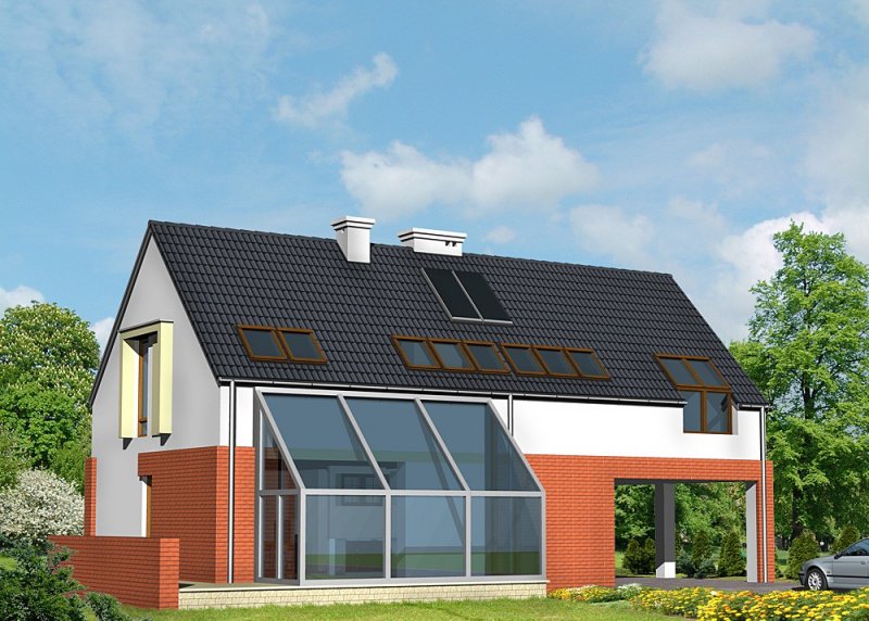 Dom jednorodzinny, parterowy, z poddaszem użytkowym oraz wiatą garażową.