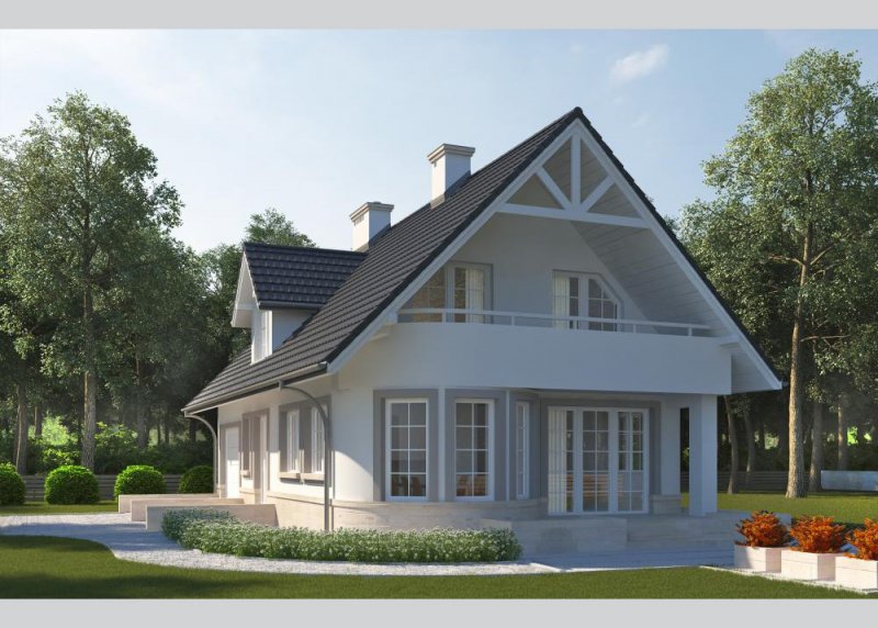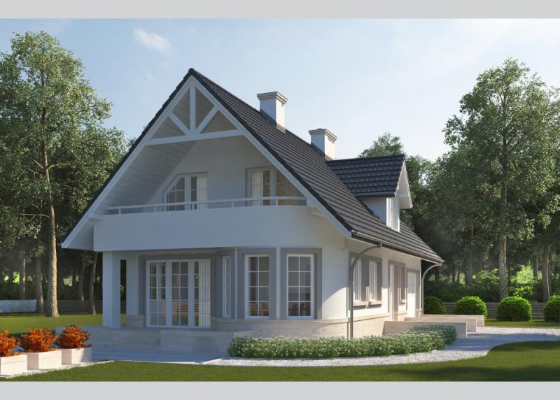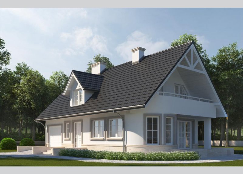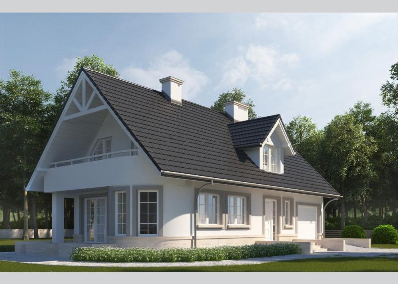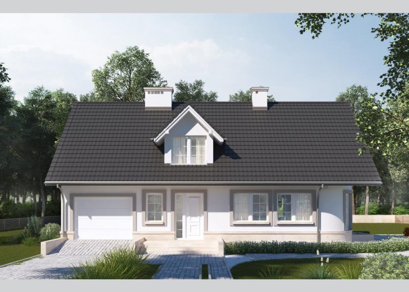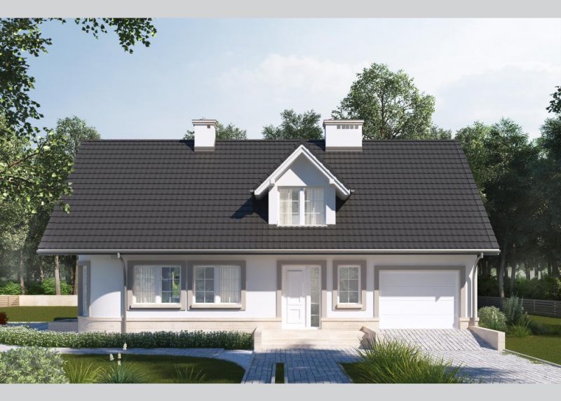 Dom jednorodzinny, parterowy, z poddaszem użytkowym i jednostanowiskowym garażem.