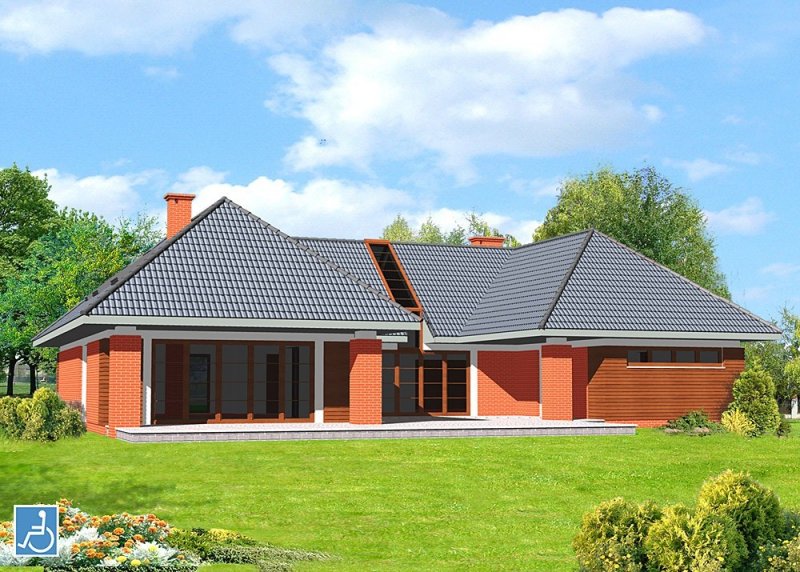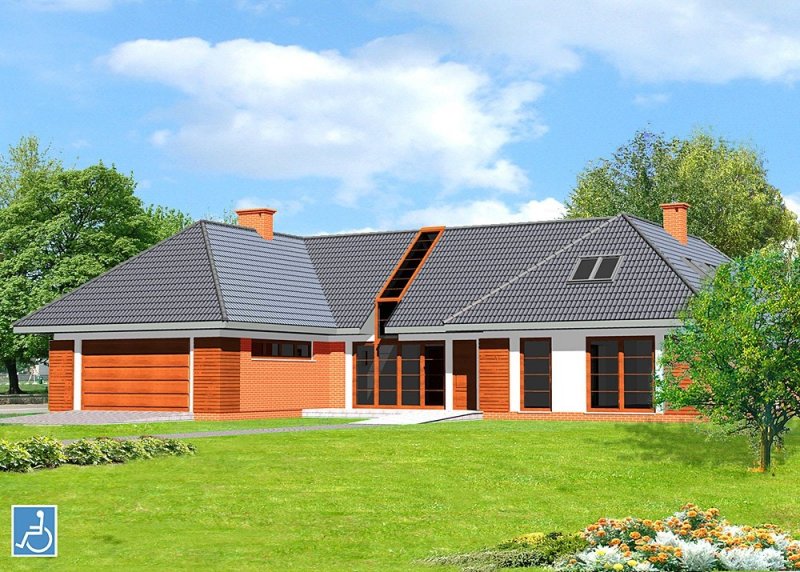 Dom jednorodzinny, parterowy, z użytkowym poddaszem i dwustanowiskowym garażem, przystosowany do użytku przez osoby niepełnosprawne.