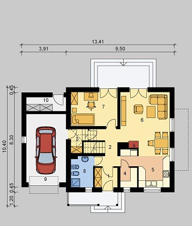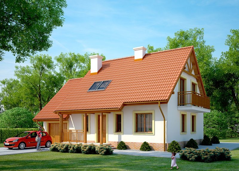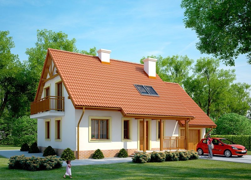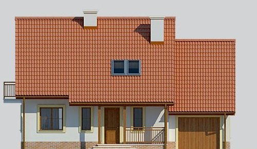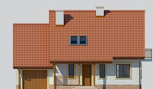 Dom jednorodzinny, parterowy z poddaszem użytkowym i jednostanowiskowym garażem.