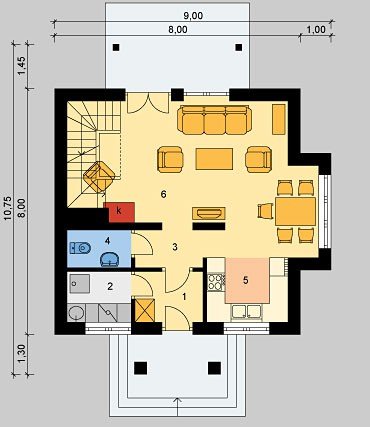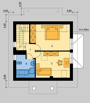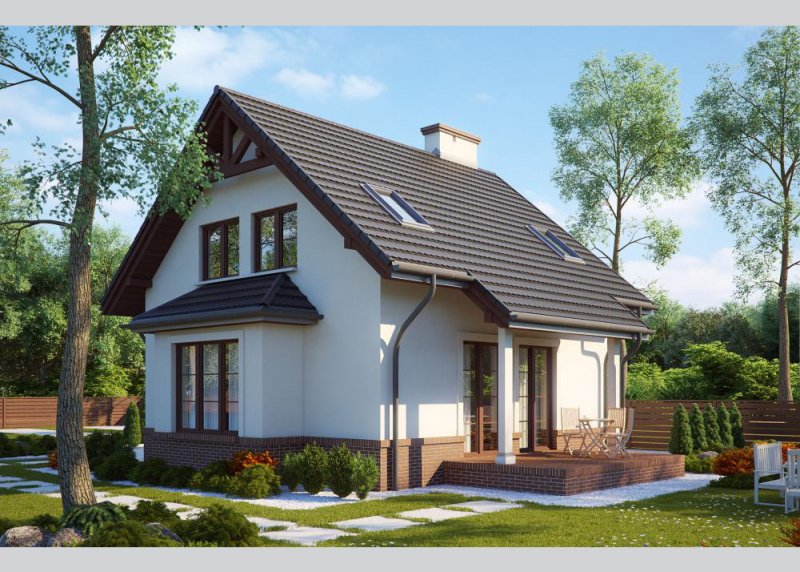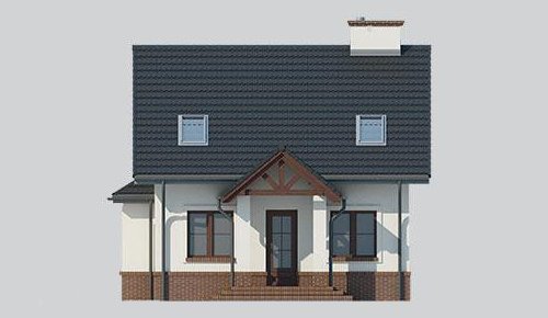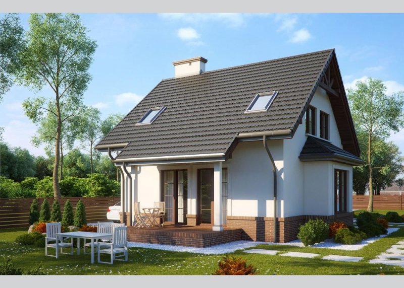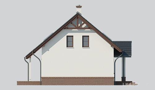 LK&573 to projekt niedużego domu jednorodzinnego, o tradycyjnej bryle. Jest to dom parterowy z poddaszem użytkowym, zaplanowany dla trzy-, czteroosobowej rodziny. Strefa wejściowa do domu poprzedzona jest niewielkim gankiem, na prawo od sieni znajduje sie kuchnia otwarta na jadalnię oraz na pokój dzienny, z którego wychodzimy na cześciowo zadaszony taras. Po lewej stronie od wejścia znajdują się kolejno kotłownia z pralnią oraz WC. W pokoju dziennym znajdują się schody prowadzące na poddasze, które stanowi strefę odpoczynku. Mieszczą się tam dwie sypialnie oraz łazienka. Projekt spełnia warunki rządowego prgramu dopłat Mieszkanie dla Młodych.