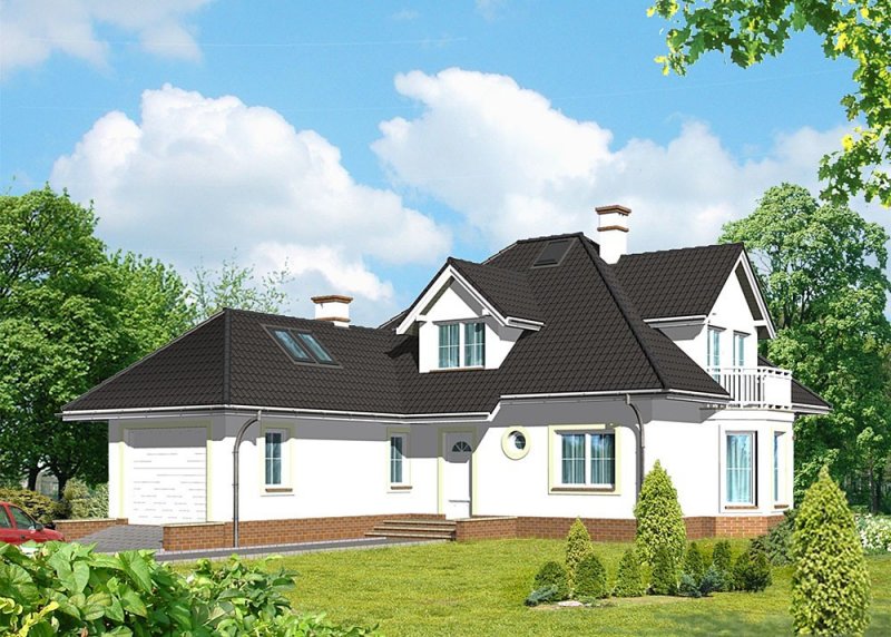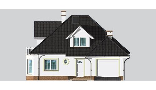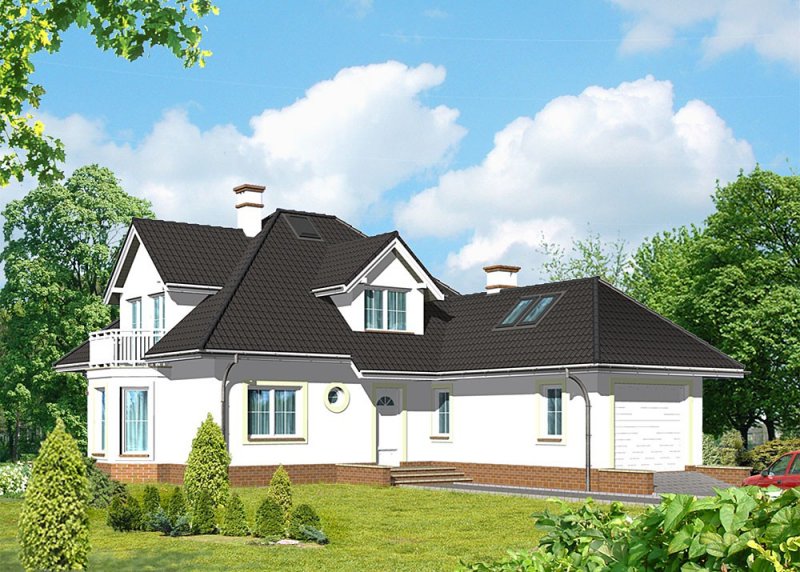 Dom jednorodzinny, parterowy, z poddaszem użytkowym i jednostanowiskowym garażem.
