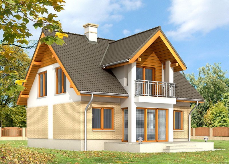 - Elewacje: wykończone tynkiem silikonowym, cokół obłożony cegłą klinkierową