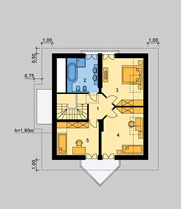 Dom jednorodzinny, parterowy, z użytkowym poddaszem oraz częściowym podpiwniczeniem.