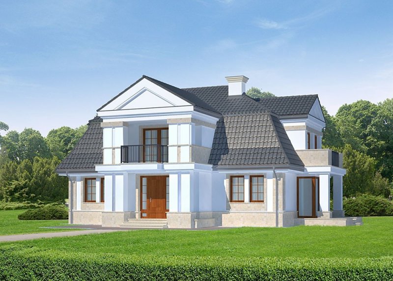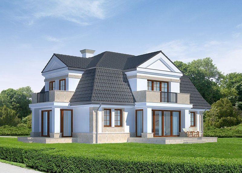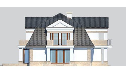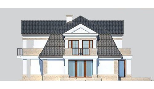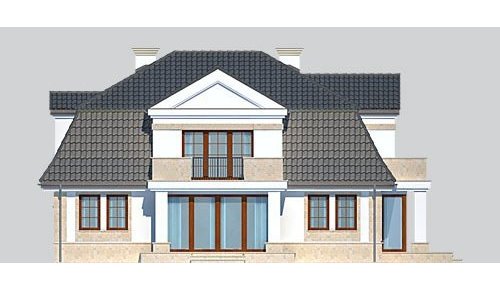 - Elewacje: wykończone tynkiem silikonowym, cokoły, opaski i gzymsy wykończone płytami z piaskowca
