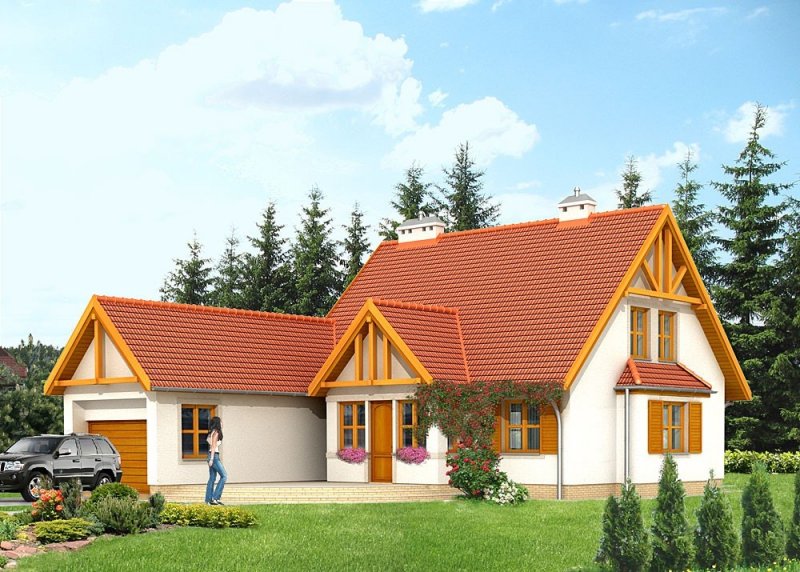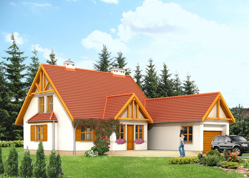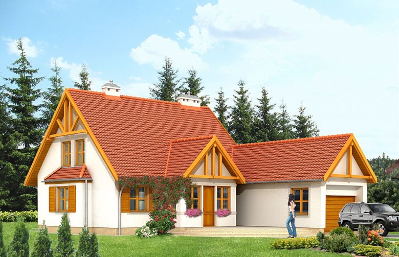 Dom jednorodzinny, parterowy, niepodpiwniczony, z poddaszem użytkowym i jednostanowiskowym garażem.