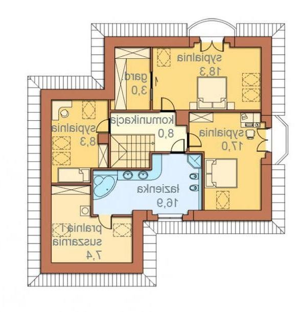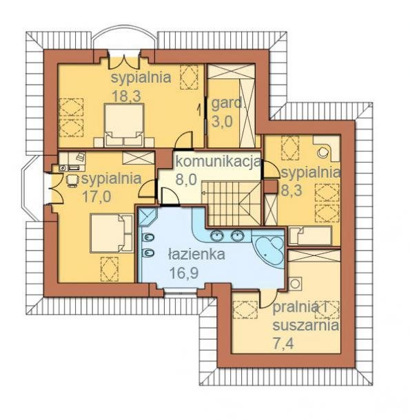 Istnieje możliwość innego podziału poddasza, przez co, bez skomplikowanych zmian otrzymamy dodatkową sypialnię, garderobę lub gabinet jeśli inwestor będzie jej potrzebował.