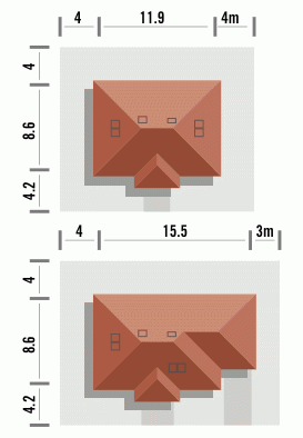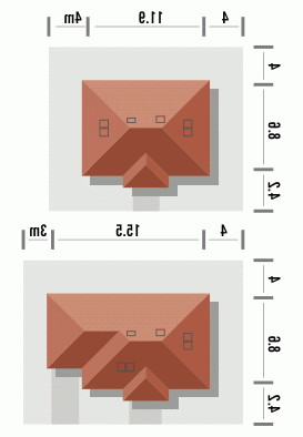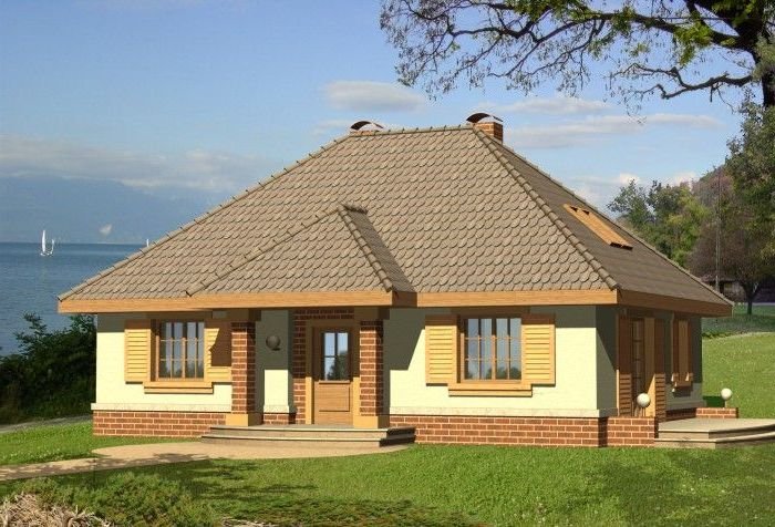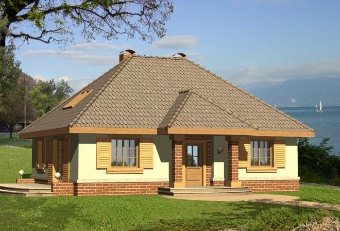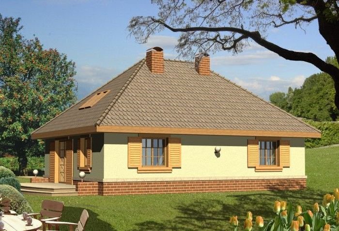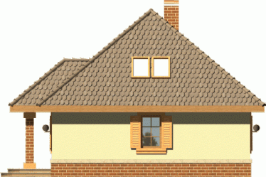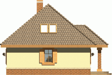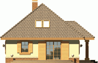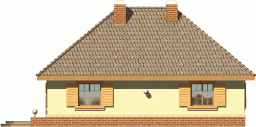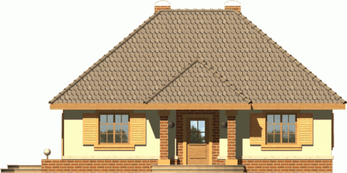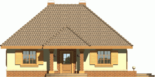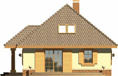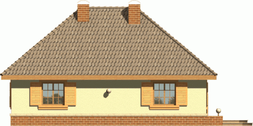 Ten niewielki dom przykryty dachem kopertowym posiada wyraźne nawiązanie do architektury dworkowej. Kominek usytuowany centralnie ułatwia zastosowanie systemu rozprowadzenia ciepła kominkowego. Ze względu na taras i wyjście z salonu z bocznej elewacji dom można realizować na działkach zarówno z północną jak i południową orientacją od strony wejścia .