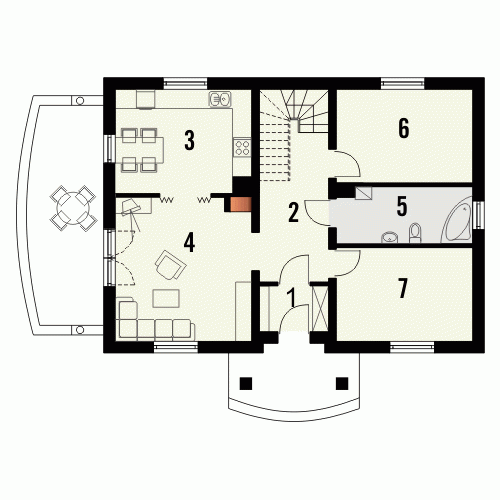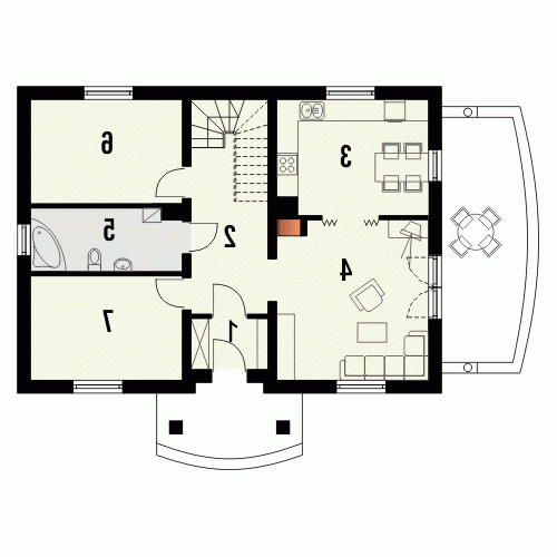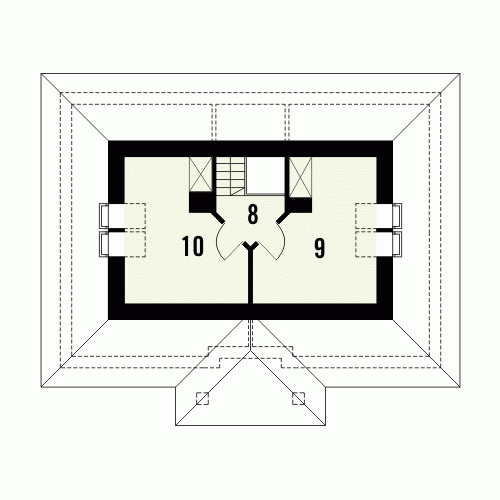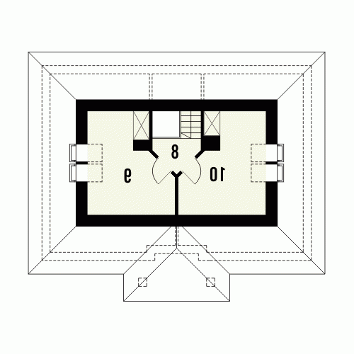 Budynek niepodpiwniczony piętrowy. Z pokoju dziennego dostępna jest duża kuchnia. Na parterze znajdują się także dwa pokoje i łazienka. Na poddaszu usytuowano dwa dodatkowe pokoje możliwe do wykończenia w późniejszym etapie. Dokumentacja dostępna również w odbiciu lustrzanym.