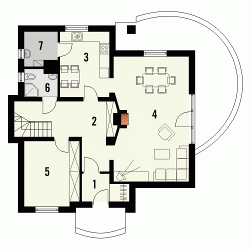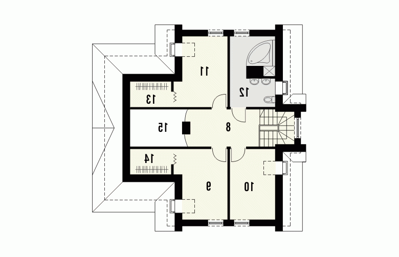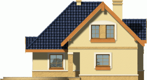 Budynek niepodpiwniczony piętrowy. Parter zajmuje salon z centralnym kominkiem, kuchnia oraz dodatkowy pokój z łazienką dostępną z korytarza. Na uwagę zasługuje wnęka garderobiana w wiatrołapie oraz możliwość wykorzystania pomieszczania gospodarczego jako spiżarni. Na piętrze znajdują się 3 sypialnie, z czego 2 posiadają garderoby i przestronna, atrakcyjnie rozwiązana łazienka. Piętro jest powiązane z parterem poprzez otwartą galerię. Dokumentacja dostępna również w odbiciu lustrzanym.