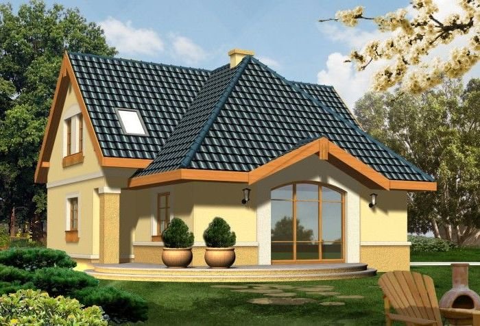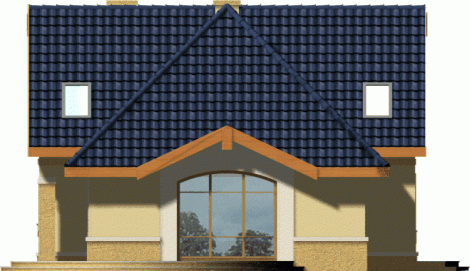 Tradycyjnie zaprojektowany budynek ma niebanalnie zaprojektowane fasady oraz efektowne duże okno od ogrodu, które otwiera jego wnętrze ku naturze.