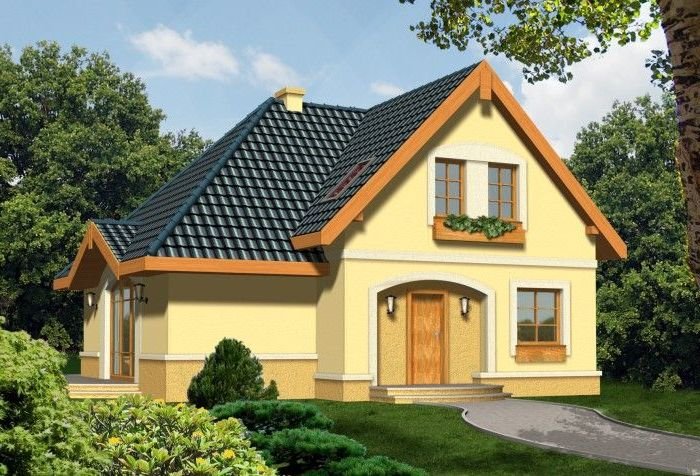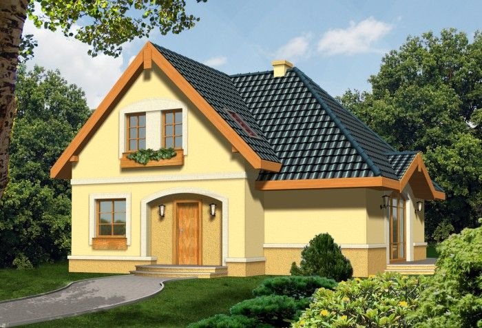 Ściany budynku zaprojektowano z betonu komórkowego docieplonego styropianem lub w innej technologii w ramach adaptacji. Strop gęstożebrowy, więźba drewniana, pokrycie dachówką ceramiczną lub cementową. Elewacje tynkowane.