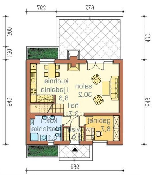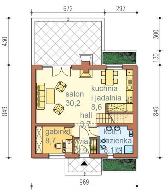 Część dzienna na parterze składa się z wiatrołapu, hallu, kuchni z jadalnią oraz pokoju dziennego i gabinetu. WC i kotłownia znajdują się w jednym pomieszczeniu.