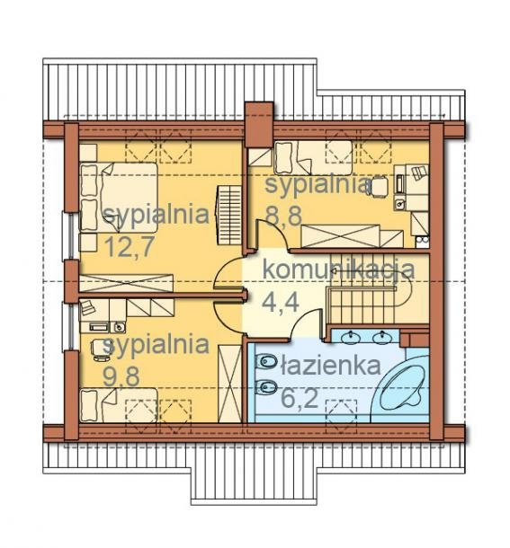 Część nocną na poddaszu tworzą: trzy sypialnie, hall i wygodna łazienka. Wszystkie sypialnie i łazienka będą doświetlone za pomocą okien połaciowych, dodatkowo dwie sypialnie posiadają okna w ścianie szczytowej.