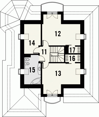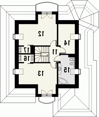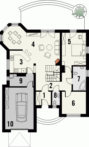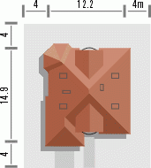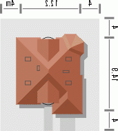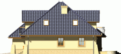 Budynek niepodpiwniczony piętrowy z wbudowanym garażem jednostanowiskowym. Na parterze zaprojektowano obok salonu z kominkiem kuchnię i wysuniętą część jadalni, duży pokój z łazienką oraz dodatkowy mniejszy pokój. Z garażu i kuchni dostępne jest pomieszczenie gospodarcze mogące pełnić dodatkowo rolę domowej spiżarni. Na piętrze pod dachem kopertowym znajdują się 2 duże sypialnie z garderobami, łazienka oraz pomieszczenie pełniące funkcję stryszku lub dodatkowego pokoiku. Dokumentacja dostępna również w odbiciu lustrzanym.