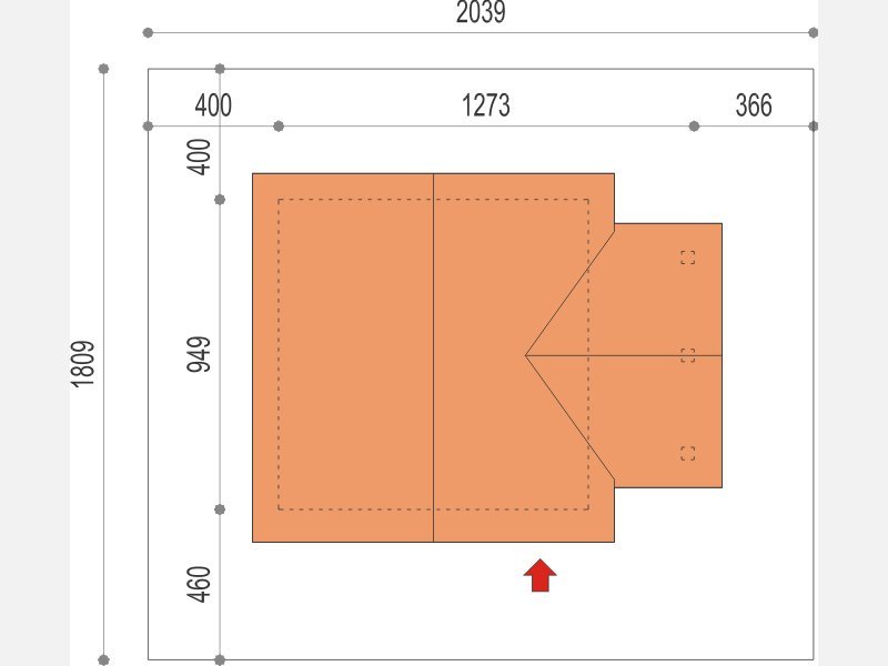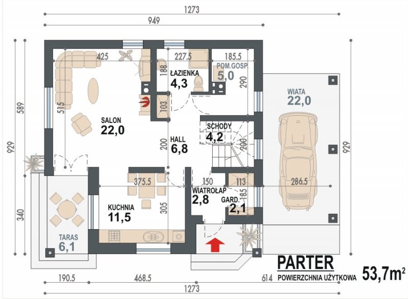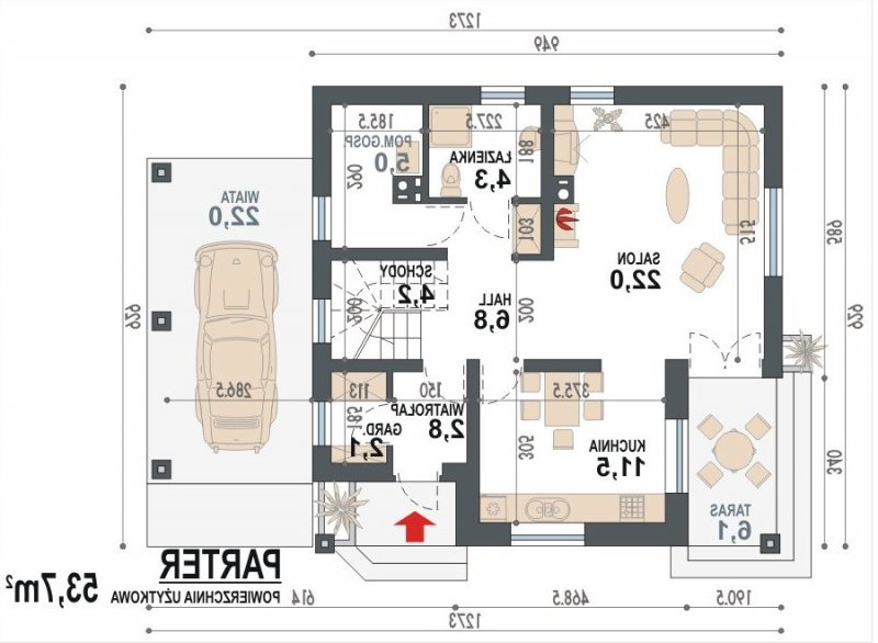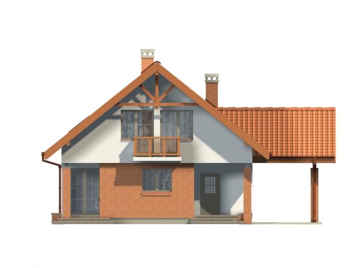na parterze zaprojektowano salon z kominkiem połączony z otwartą kuchnią, łazienkę, garderobę, wiatrołap oraz wiatę na samochód (do zabudowania na garaż w II etapie)