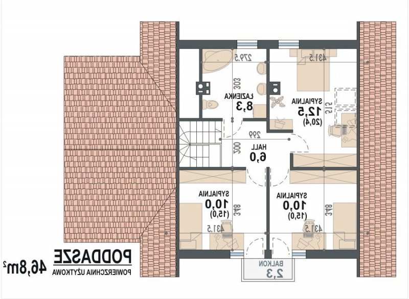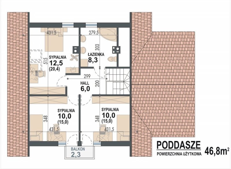 na poddaszu zaprojektowano 3 sypialnie i dużą łazienkę