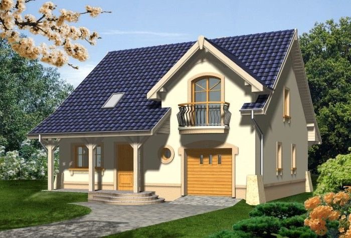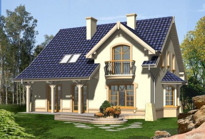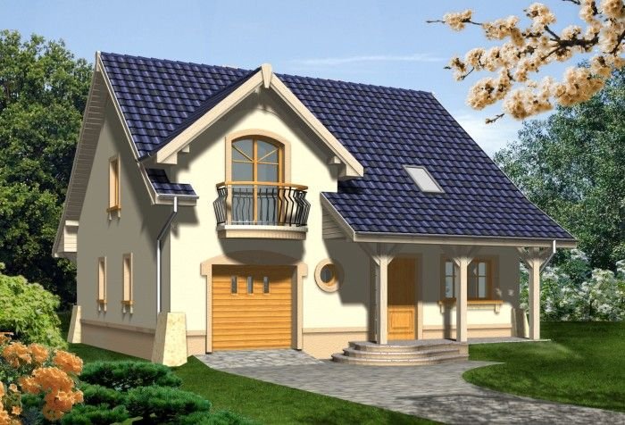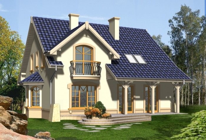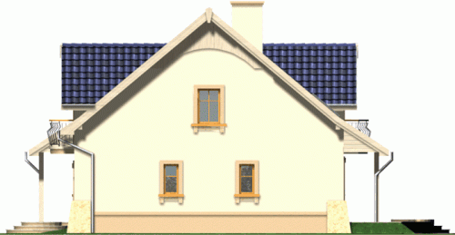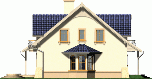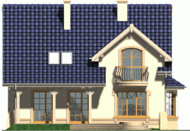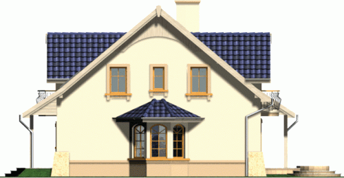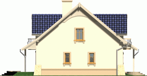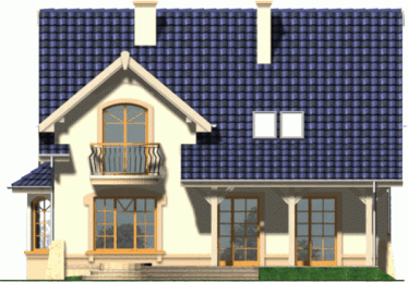 Klasyczny dom z dachem dwuspadowym z charakterystycznymi podcieniami pod dachem od strony wejścia i ogrodu. Uwagę zwracają łukowe okna wyjściowe na balkony oraz fantazyjne tarasy.