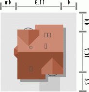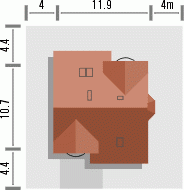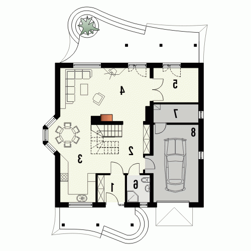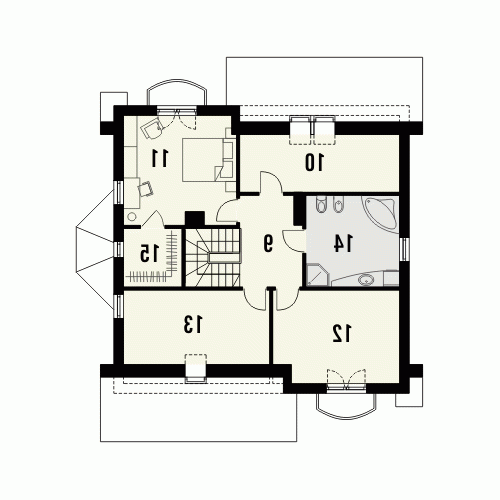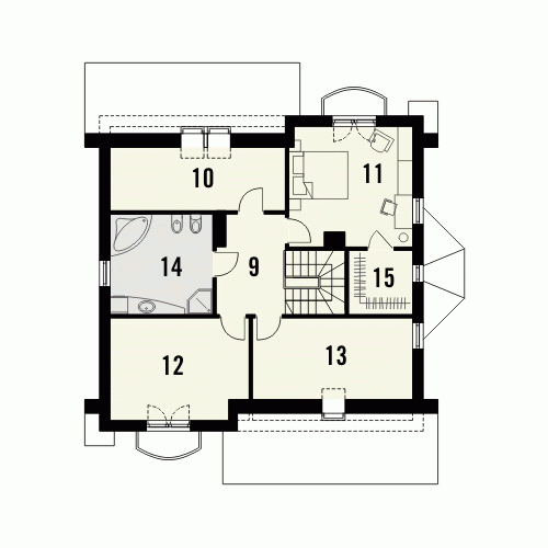 Budynek niepodpiwniczony piętrowy z garażem jednostanowiskowym. Na parterze zaprojektowano pokój dzienny, kuchnię z jadalnią, dodatkowy pokój - np. bibliotekę, łazienkę i pomieszczenie gospodarcze. Zaletą domu jest ciekawy wykusz jadalni z łukowymi oknami. Na poddaszu znajdują się cztery pokoje, łazienka i garderoba. Dokumentacja dostępna również w odbiciu lustrzanym.