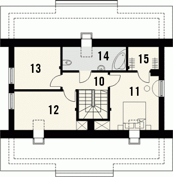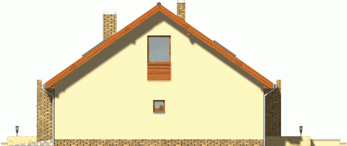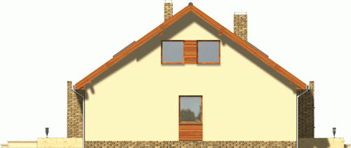 Budynek niepodpiwniczony, piętrowy z garażem. Na parterze obok pokoju dziennego i otwartej kuchni znajdują się 2 pokoje, łazienka i pomieszczenie gospodarcze. Na poddaszu pod dachem stromym zaprojektowano 3 sypialnie, łazienkę i garderobę. Dokumentacja dostępna również w odbiciu lustrzanym.