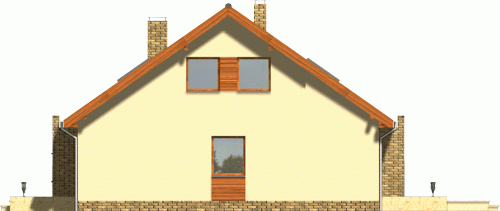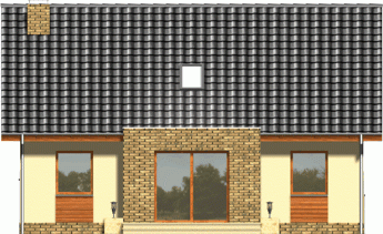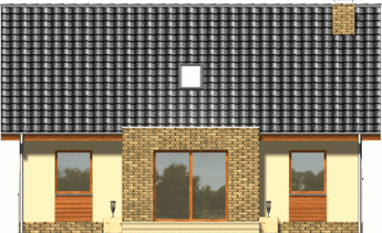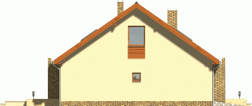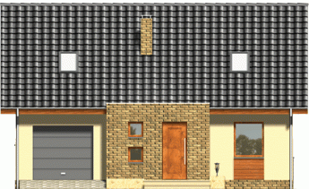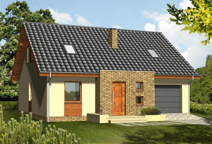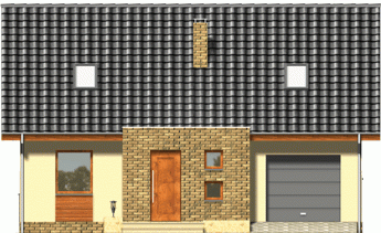 Niewielki, kompaktowy dom z garażem zintegrowanym w bryle głównej. Dzięki prostej konstrukcji i oszczędnie rozplanowanym rzutom udało się zmieścić na niewielkiej powierzchni bardzo bogaty program funkcjonalny. Z zewnątrz dodatkowego uroku dodają fragmenty ścian oraz cokoły okładane płytką klinkierową.