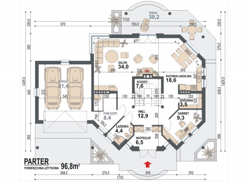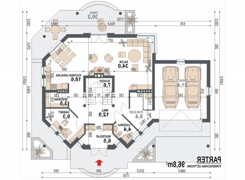 * na parterze zaprojektowano reprezentacyjny otwarty salon z kominkiem połączony z jadalnią, otwartą kuchnię, łazienkę oraz garaż dwustanowiskowy, kotłownię i pomieszczenie gospodarcze, ciekawie zaprojektowana klatka schodowa